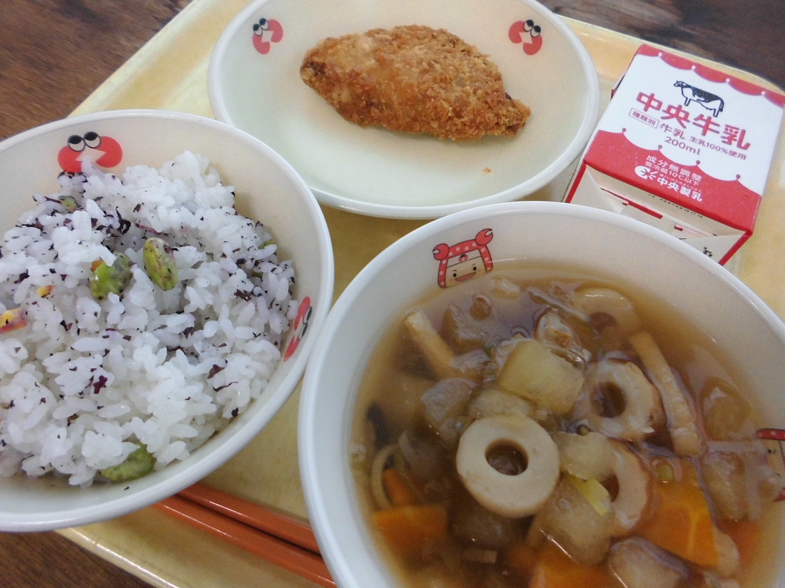 【献立】牛乳 ご飯 枝豆の赤しそご飯の具 冬瓜汁 鯵フライ