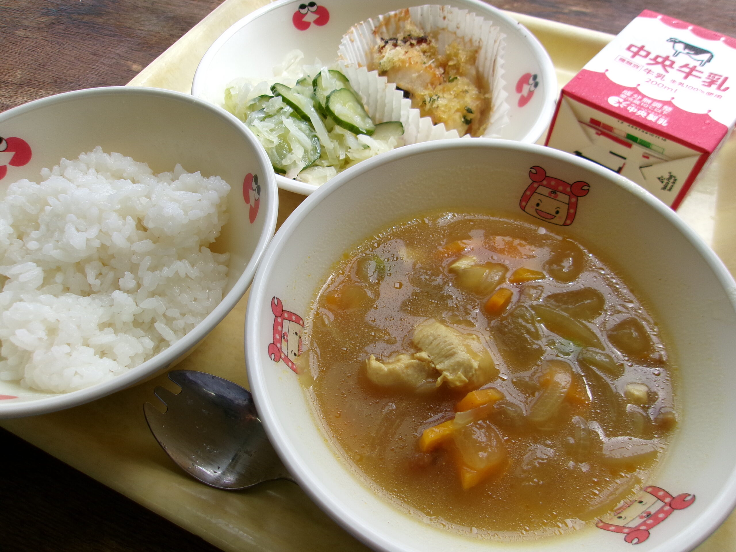 【献立】牛乳 ご飯 冬瓜入りカレースープ ホキのパン粉焼き フレンチサラダ
