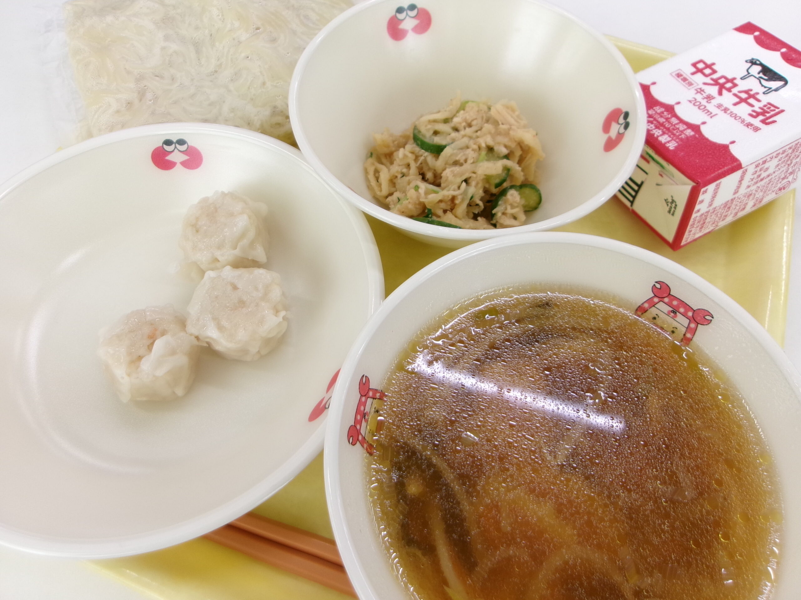 【献立】牛乳 中華麺 ラーメンの汁 エビ焼売 切り干しバンバンジー