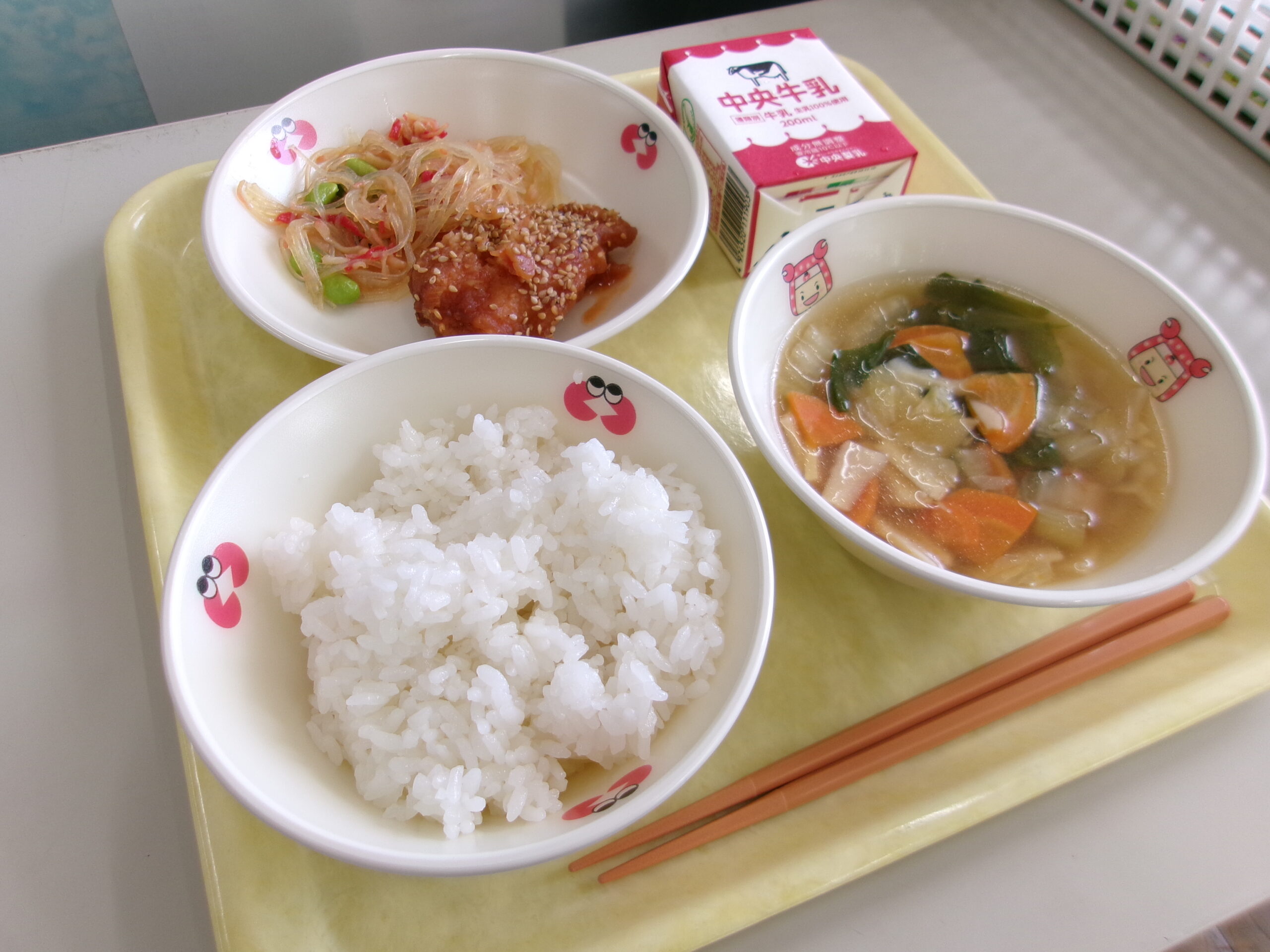 【献立】牛乳 ご飯 ワンタンスープ ヤンニョムチキン 春雨サラダ