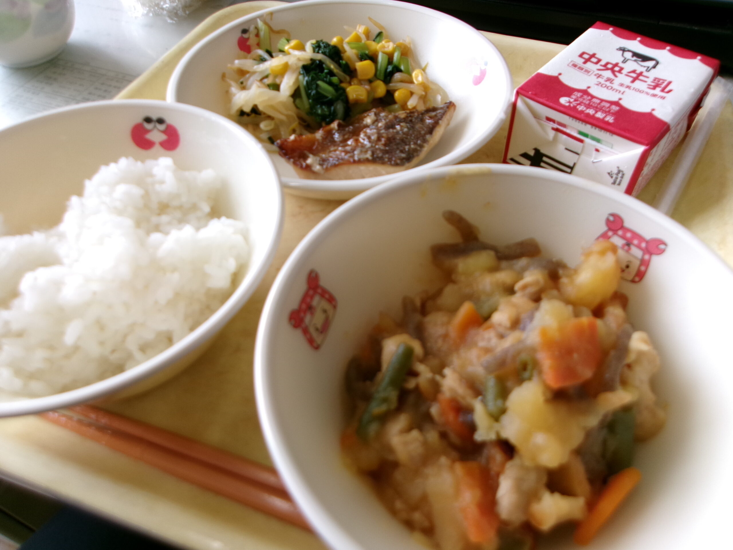 【献立】牛乳 ご飯 肉じゃが メバルの煮つけ 小松菜とベーコンの和え物