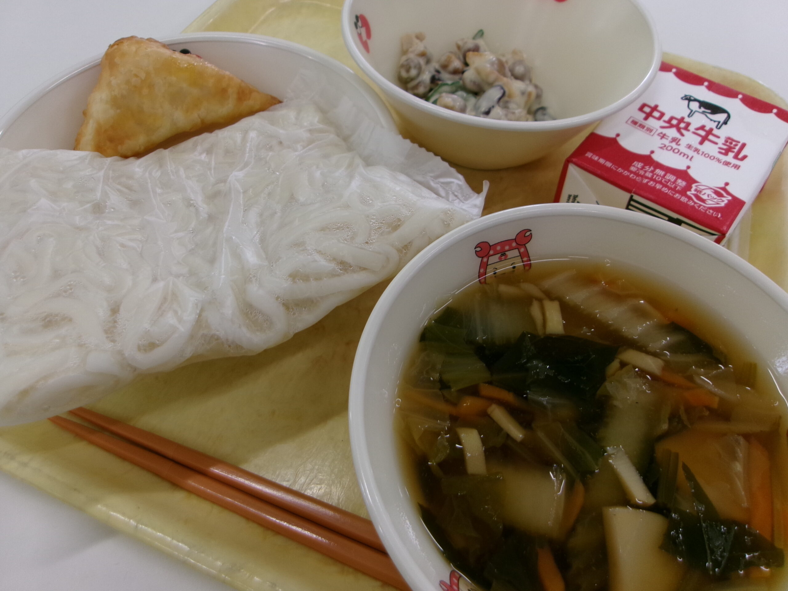 学校ブログ 今日の給食 9月24日(水) 2025.09.242025.10.21 by kaniekita002 2025年9月24日(水) 【献立】牛乳 白玉うどん 五目うどんの汁 豆まめサラダ 手作りアップルパイ🍎 KODAK Digital Still Camera <手作りアップルパイ> 今日のアップルパイは、給食センターで一つずつ手作りされています。乳や卵を使用していない「パイ生地」に、角切りにした甘いりんごが包まれています。調理員の皆さんが一つ一つ作ってくださったアップルパイ🍎味わっていただきます。