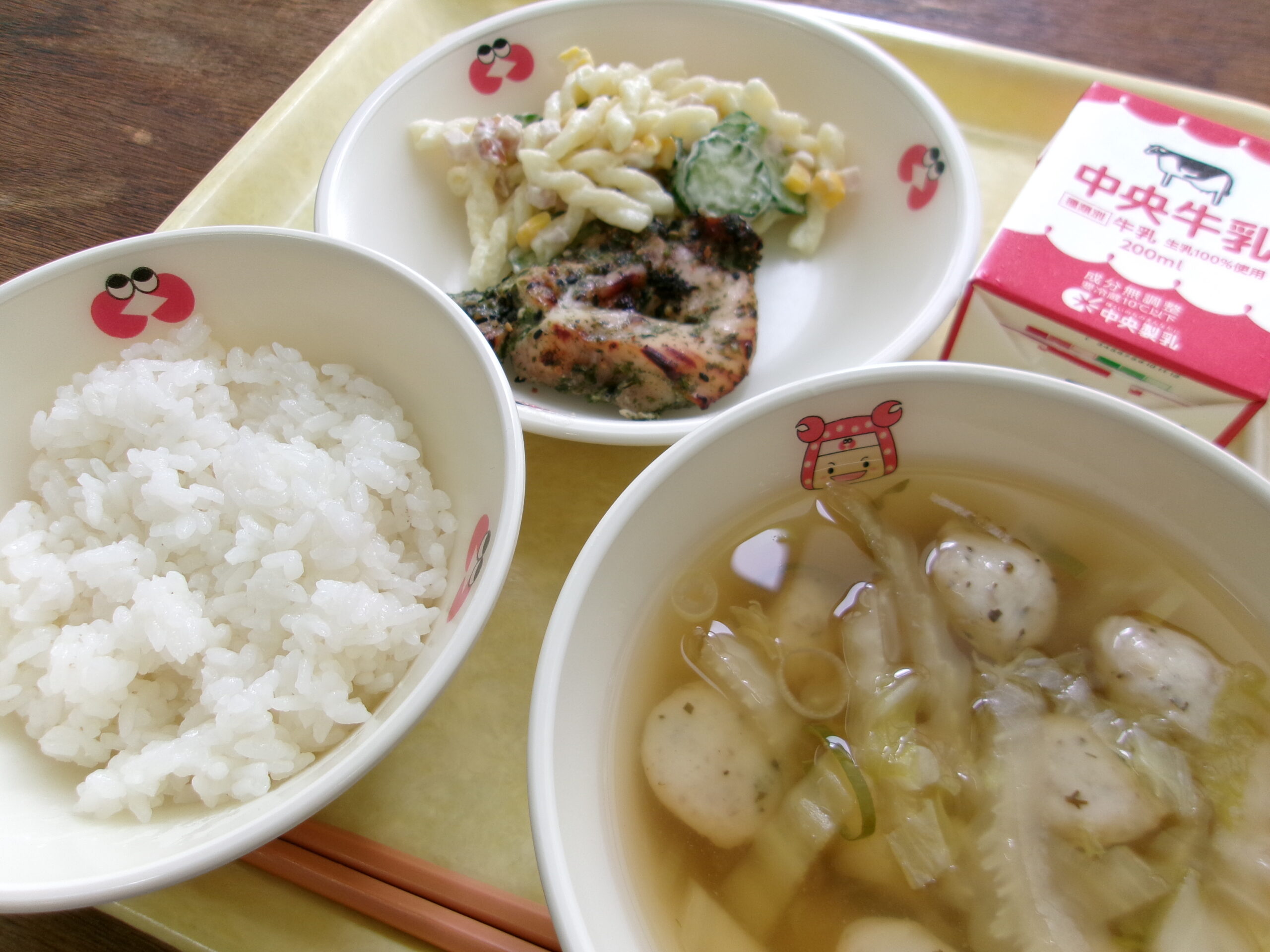 【献立】牛乳 ご飯 あかもく団子汁 鶏肉の磯辺焼き マカロニサラダ