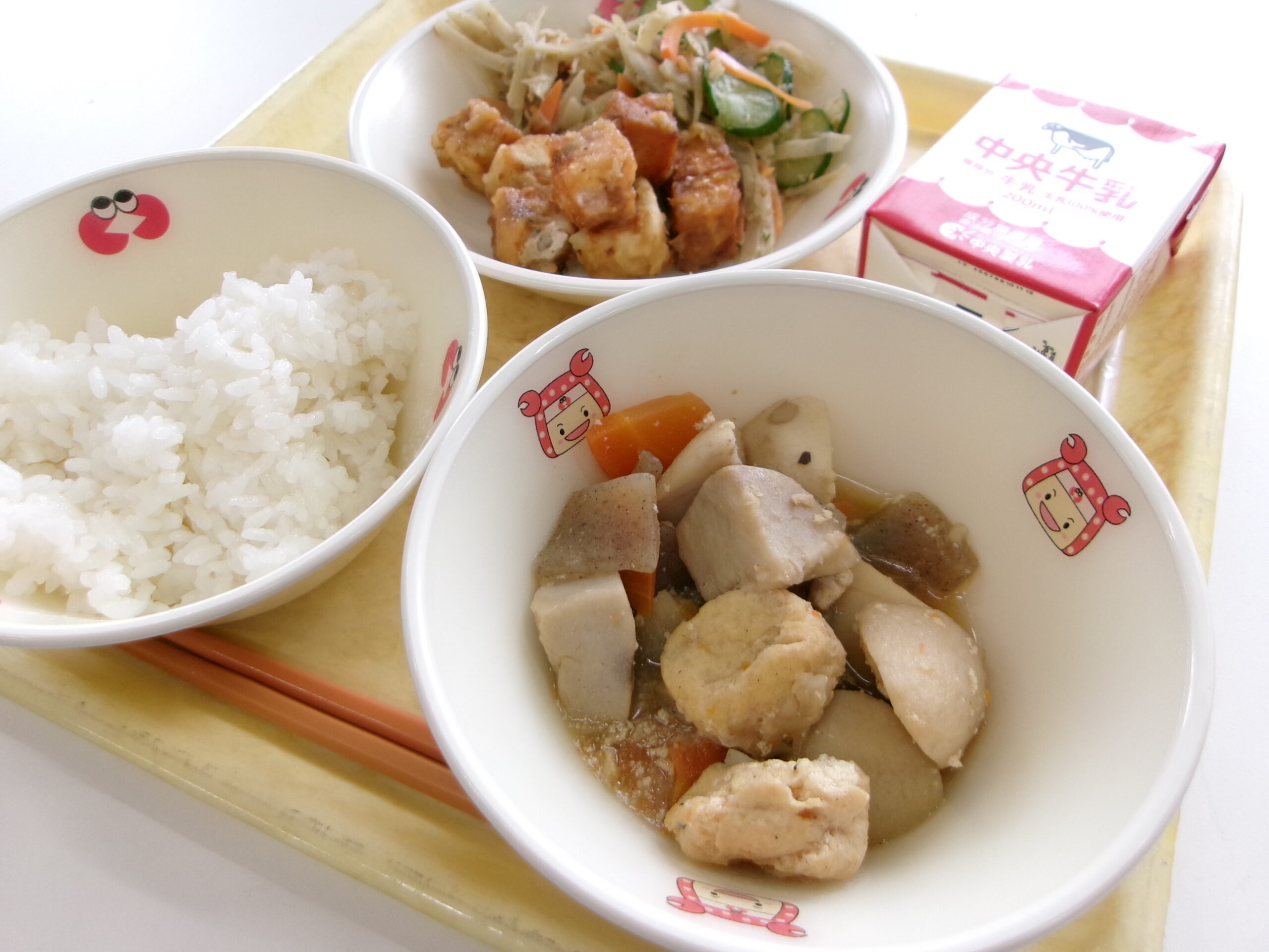 【献立】牛乳 ご飯 里芋の煮っ転がし 鮭の土佐酢漬け ごぼうサラダ