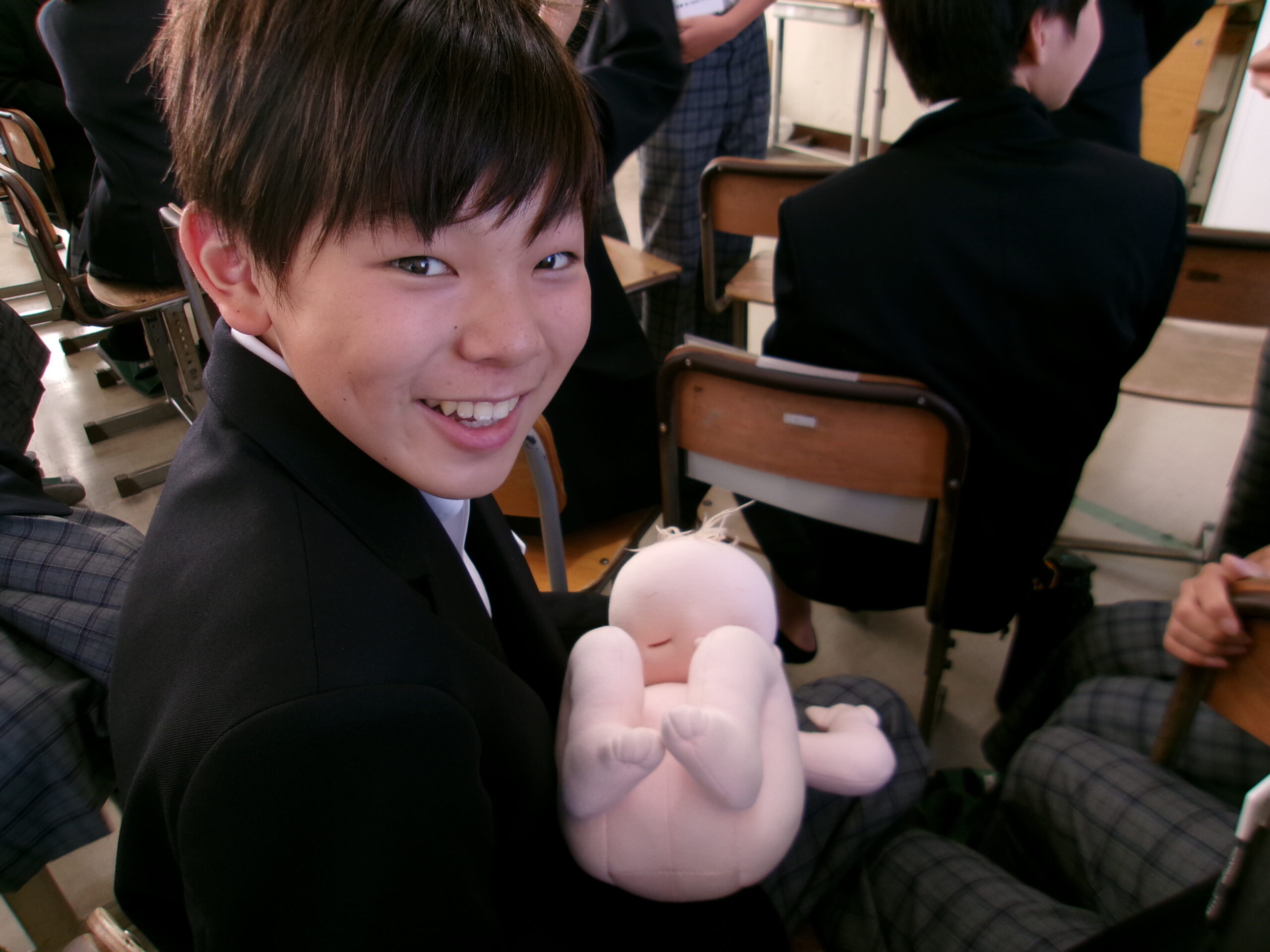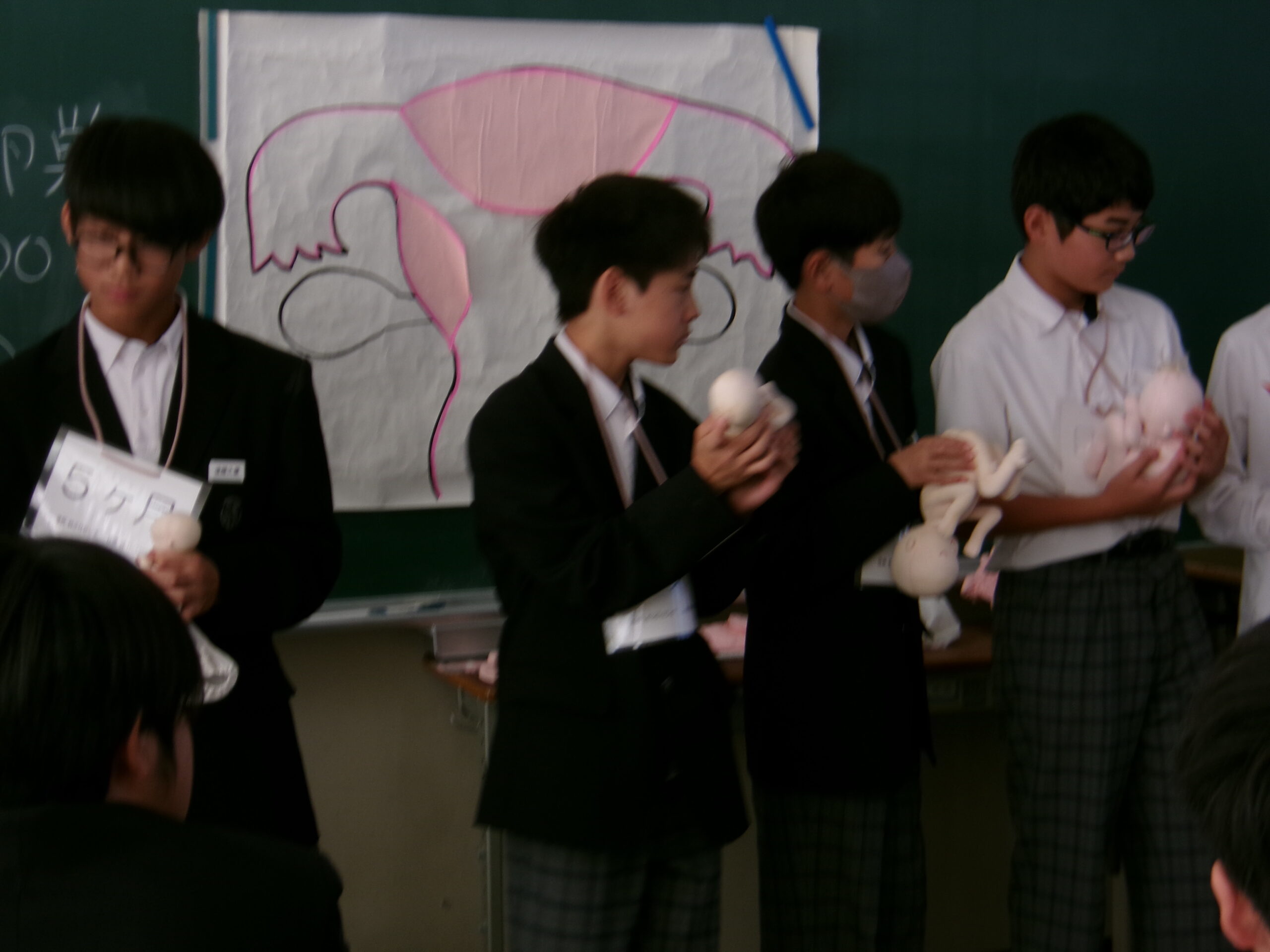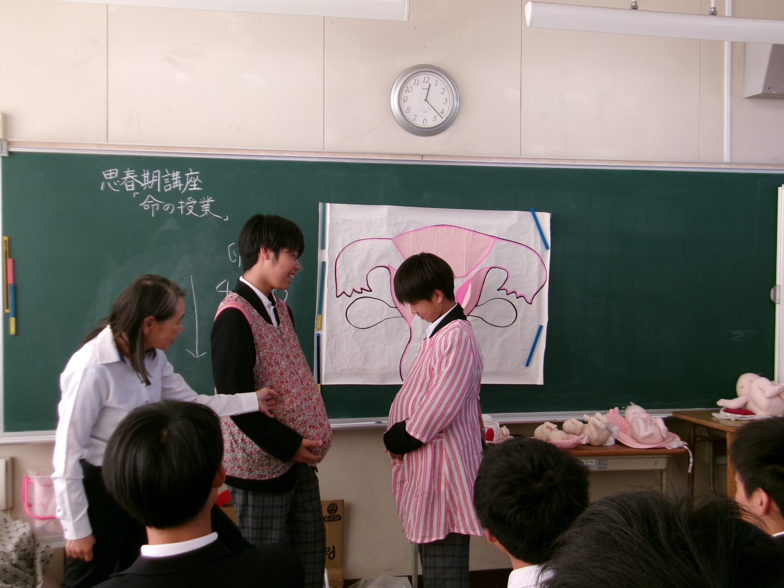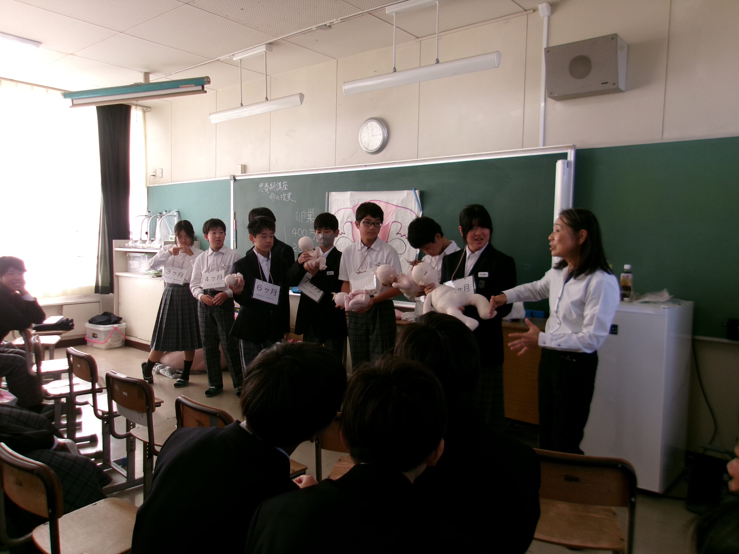 今日は、大阪医専助産師学科の伊藤幸子先生を講師として招き、養護教諭と共に1年生を対象に「いのちの誕生」について授業を行っていただきました。