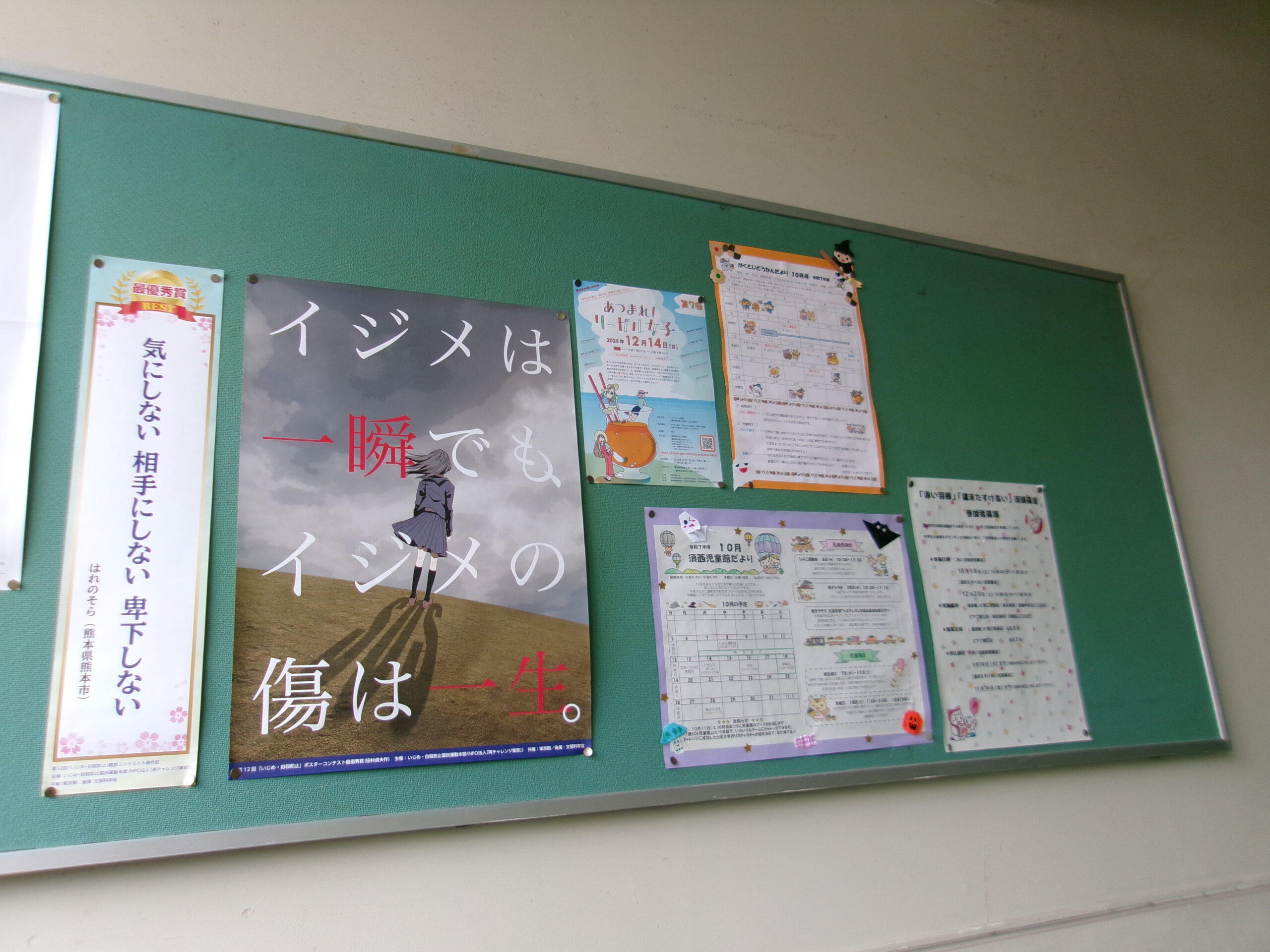 学校ブログ 校内には掲示物がいっぱい 2025.10.24 by kaniekita002 2025年10月24日(金) 校内の廊下には、多くの物を掲示しています。 3年生教室前掲示板には進路関係の掲示物。階段の踊り場掲示場には、人権啓発ポスターや地域行事の案内。 職員室前掲示板には、健康意識向上に関する掲示物や校内の1年間の歩み。 内容が変わったり、追加掲示があったりすると、生徒たちは立ち止まって見ています。