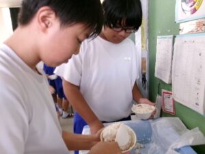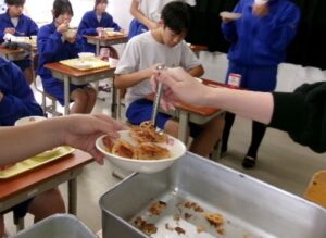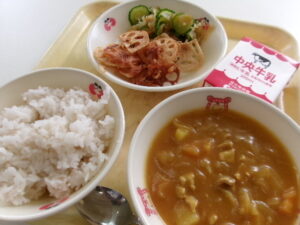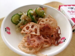 学校ブログ 今日の給食 10月27日(月) 2025.10.27 by kaniekita002 2025年10月27日(月) 【献立】牛乳 麦ごはん 米粉のカレーライス 福神和え れんこんチップス <れんこんの話> れんこんの旬は、秋から冬にかけてです。愛知県では、木曽川の低湿地に位置する愛西市でたくさん栽培されています。愛西市では、露地栽培とハウス栽培を組み合わせて、ほぼ一年中出荷されています。愛知県では、泥のついた状態で出荷し、変色を防ぎ、新鮮さを保つ工夫をしています。 給食の「れんこんチップス」は、人気メニューの一つです。もちろん、食缶は空になります。
