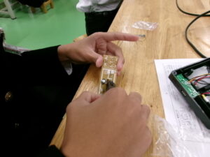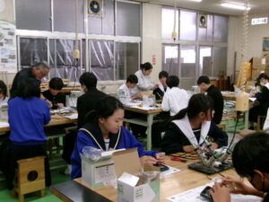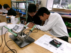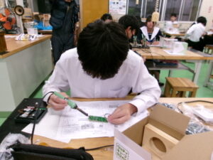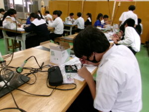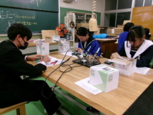 2年生の技術科では、「エネルギー変換の技術」について学習しています。はんだごて、ニッパーを使用し、発電装置を作り、エネルギー変換の仕組みを確認します。