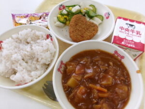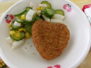 今日の給食は、南瓜を使ったコロッケとパフ(お米のお菓子)です。南瓜の甘みを楽しんで、味わいましょう♪