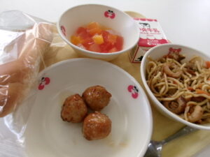 【献立】牛乳 小型ロールパン 焼きそば ごぼう入りつくね 紅葉ゼリーポンチ