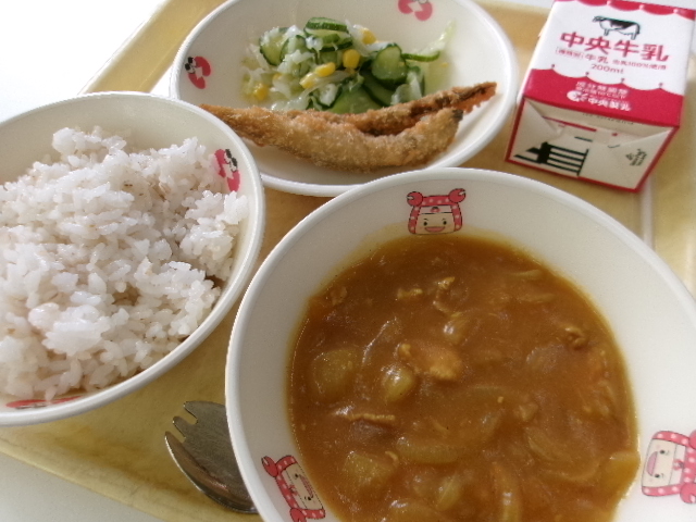 【献立】牛乳 米粉のカレーライス(麦ご飯)🍛 子持ちししゃもフライ キャベツとコーンのサラダ