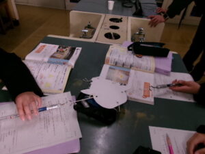 今日は、「力のつり合い」について学びました。2つの力が1つの物体にはたらいているのに物体が動かないとき、2つの力にはどのような関係があるのかを実験を通して考えました。