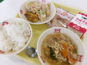 学校ブログ 今日の給食 11月25日(火) 2025.12.02 by kaniekita002 2025年11月25日(火) 🎂バースデーランチ🎂 11月生まれの皆さんの誕生日をお祝いするバースデーランチです。 お誕生日おめでとうございます! 【献立】牛乳 ご飯 鶏肉のカレー風味焼き アルファベットスープ 和風ポテトサラダ バースデーデザート(ポンデドーナツ)