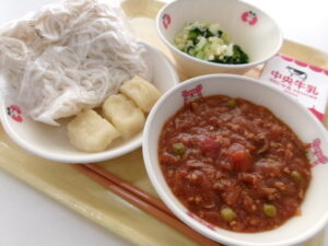 【献立】牛乳 ソフト麺 ミートソースの具 いかフリッター チーズサラダ