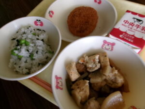 今日の給食は、蟹江北中学校3年C組からリクエストのあった「枝豆ごはん」です。