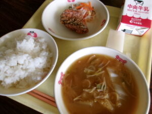 今日は「煮和え」に大根が使われています。「煮和え」は、愛知県の郷土料理で、正月や祭り、盆の精進料理などで食べられてきました。よく噛み、郷土の味を楽しみましょう。