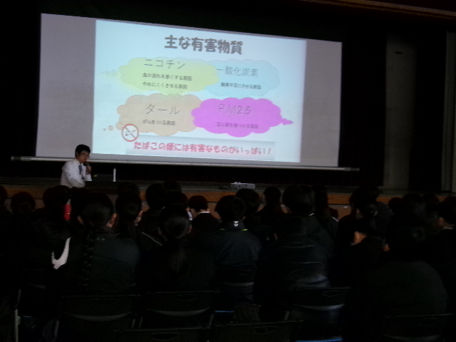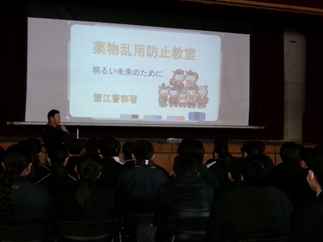 1年生を対象に、学校薬剤師さん、蟹江警察署スクールサポーターの方を講師として招き、薬物乱用防止教室を行いました。