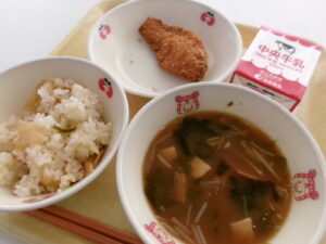 【献立】牛乳 キムタクご飯 玉ねぎの味噌汁 サーモンフライ