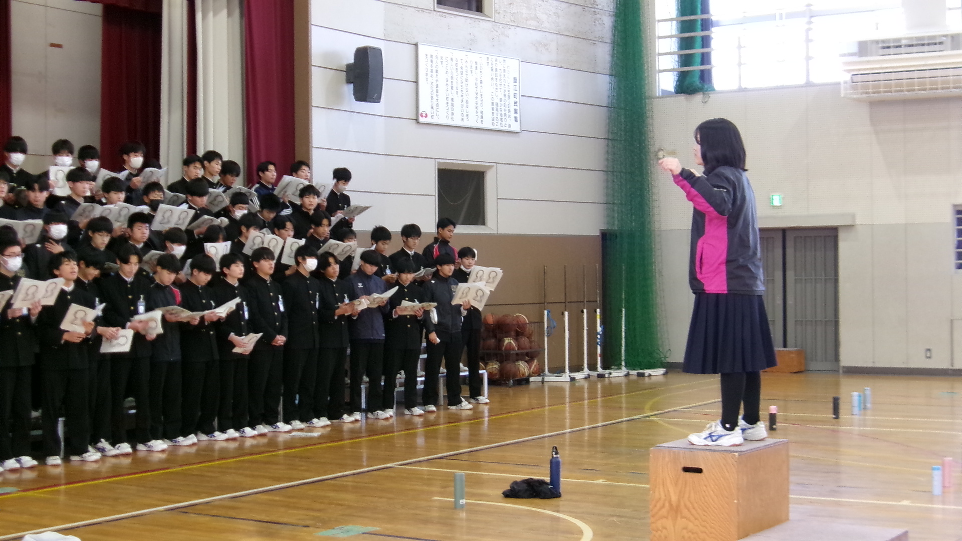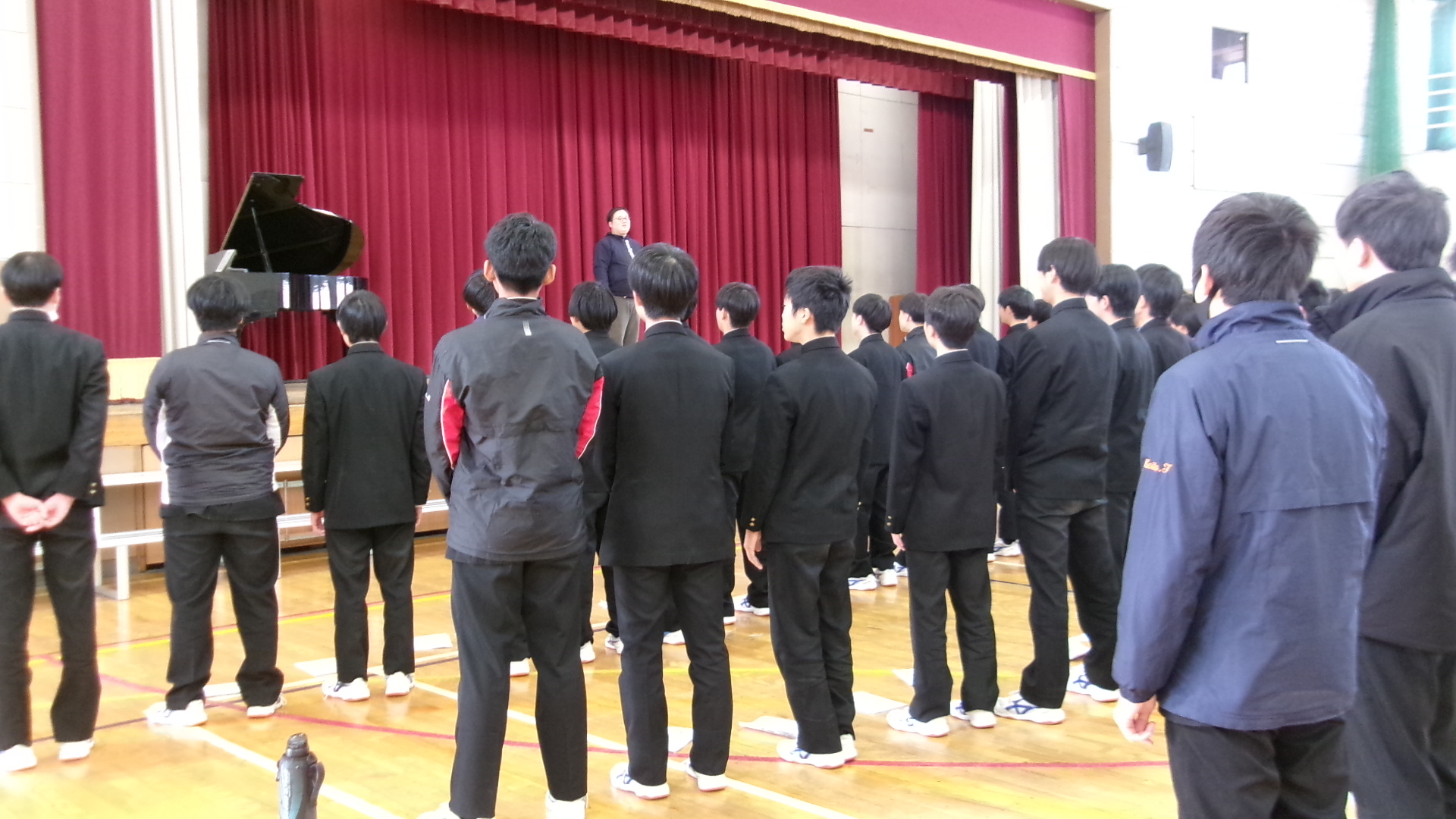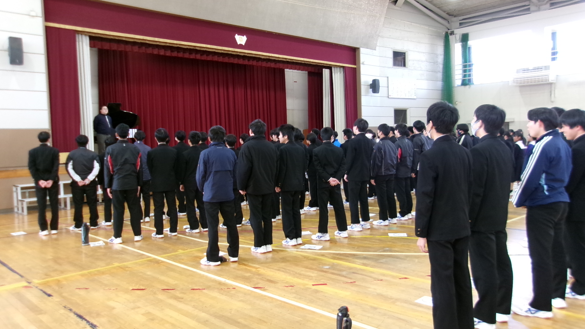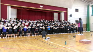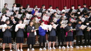 「君が代」は、厳かな場に相応しい落ち着いた斉唱となるようにすることが重要です。そのような歌い方になるよう、学年主任が生徒たちの前で独唱しました。体育館に響き渡る歌声。生徒たちは、物音一つ立てることなく、静かに聞き入りました。そのような雰囲気を醸し出せるよう、練習に取り組みました。