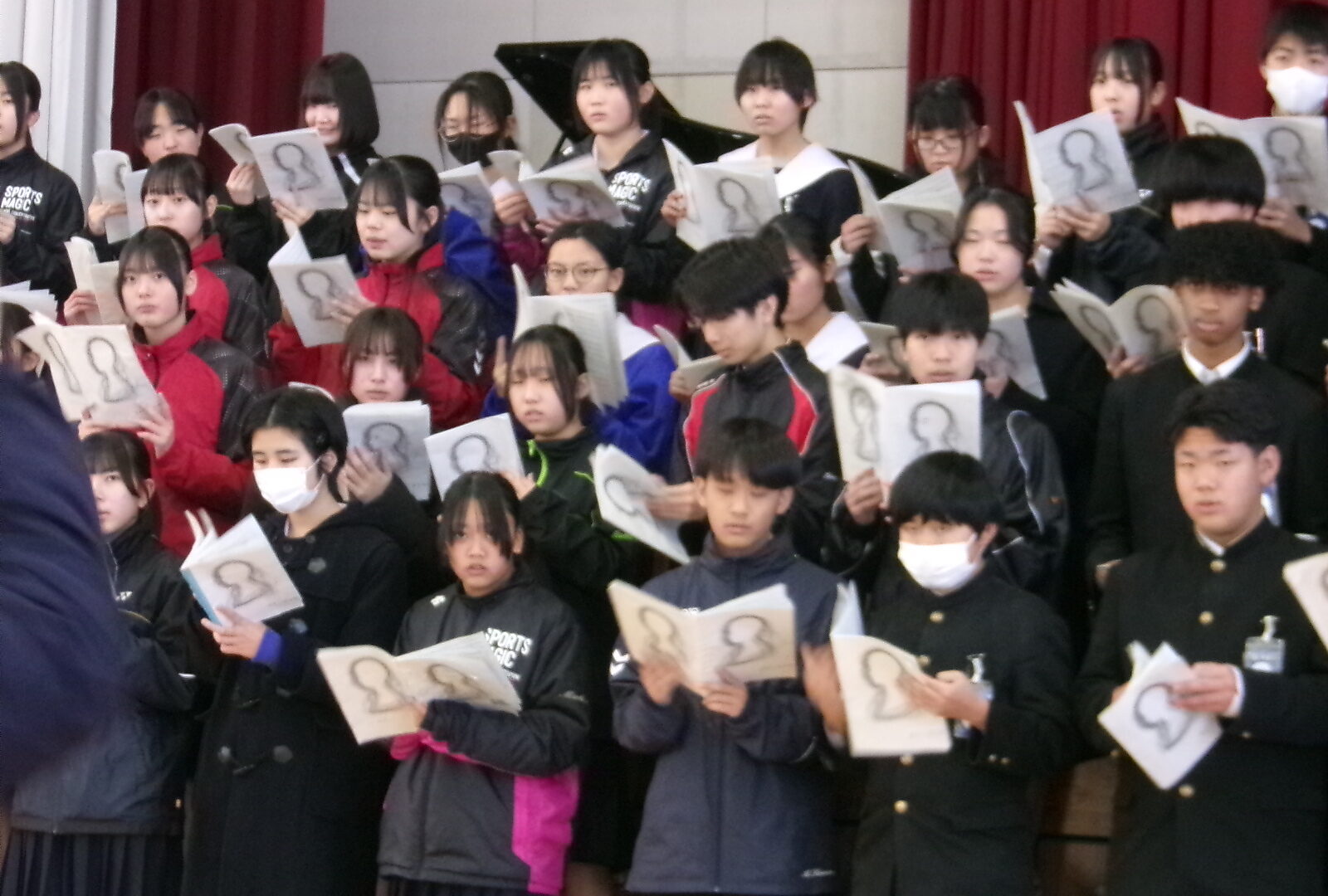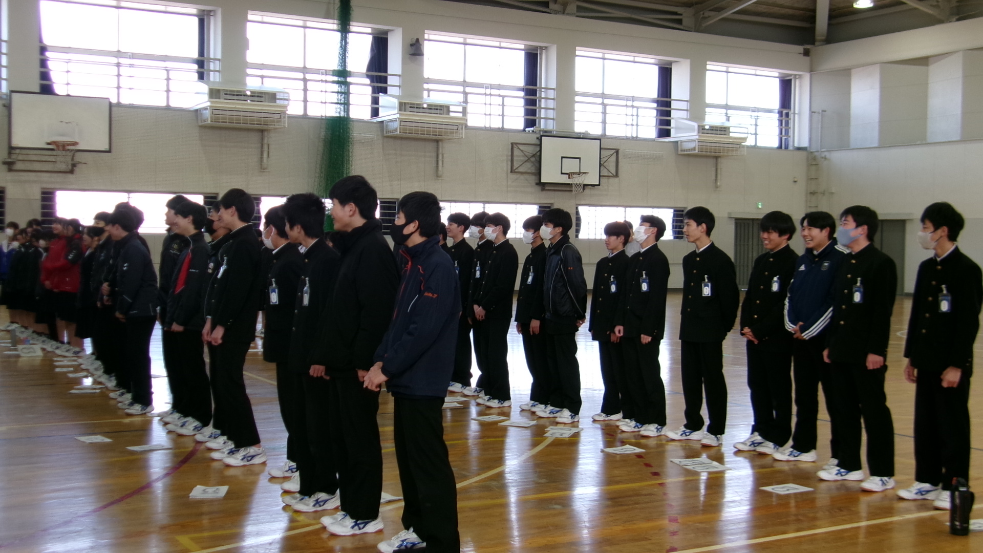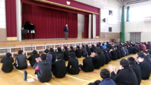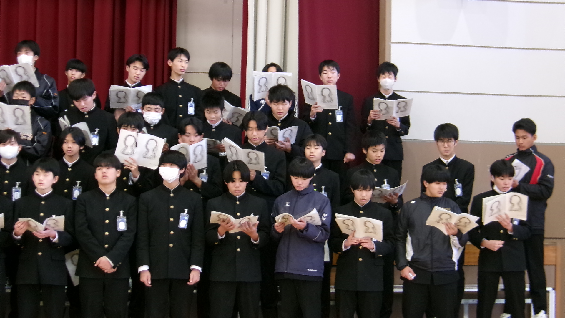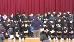 「君が代」は、厳かな場に相応しい落ち着いた斉唱となるようにすることが重要です。そのような歌い方になるよう、学年主任が生徒たちの前で独唱しました。体育館に響き渡る歌声。生徒たちは、物音一つ立てることなく、静かに聞き入りました。そのような雰囲気を醸し出せるよう、練習に取り組みました。