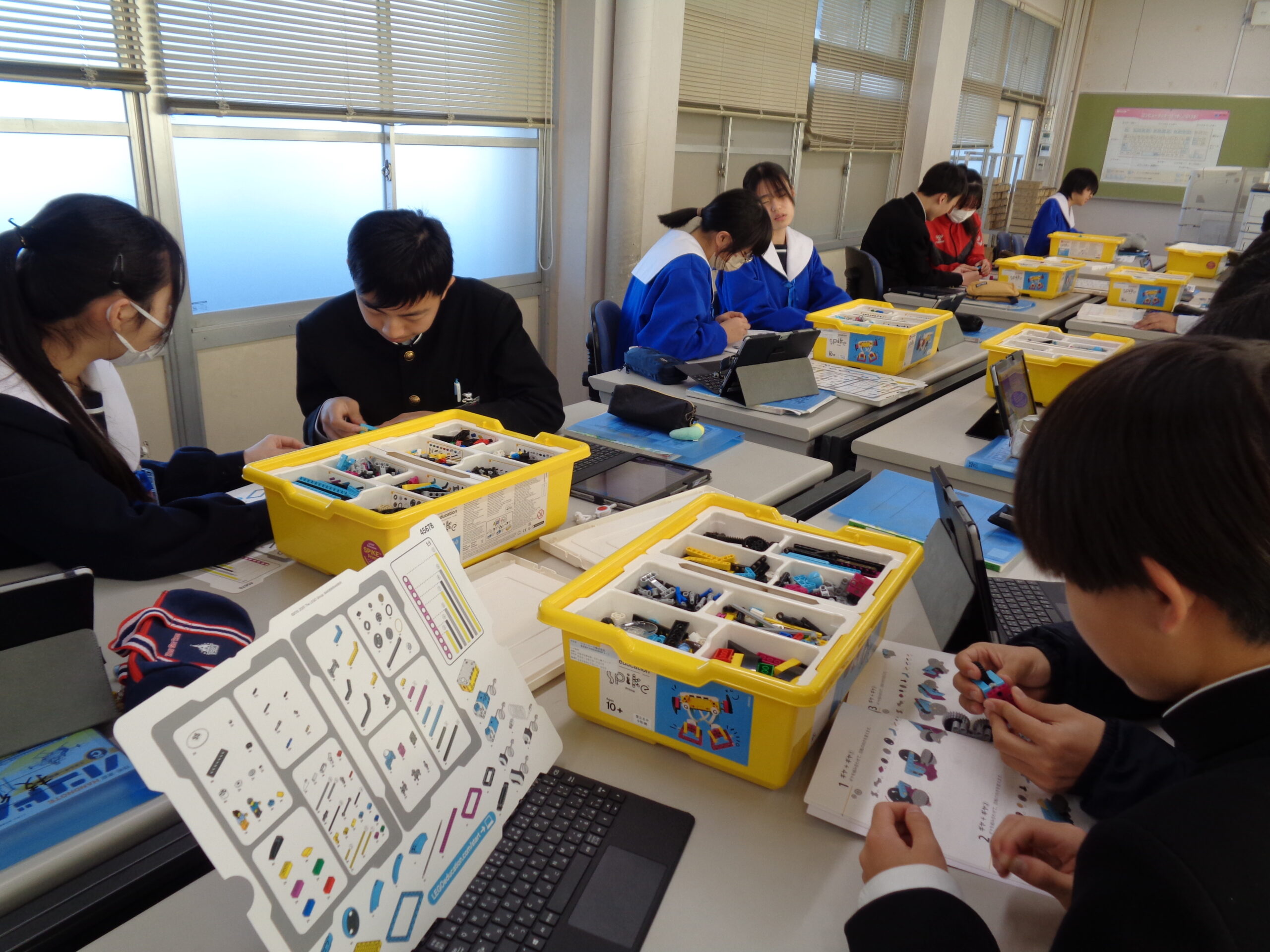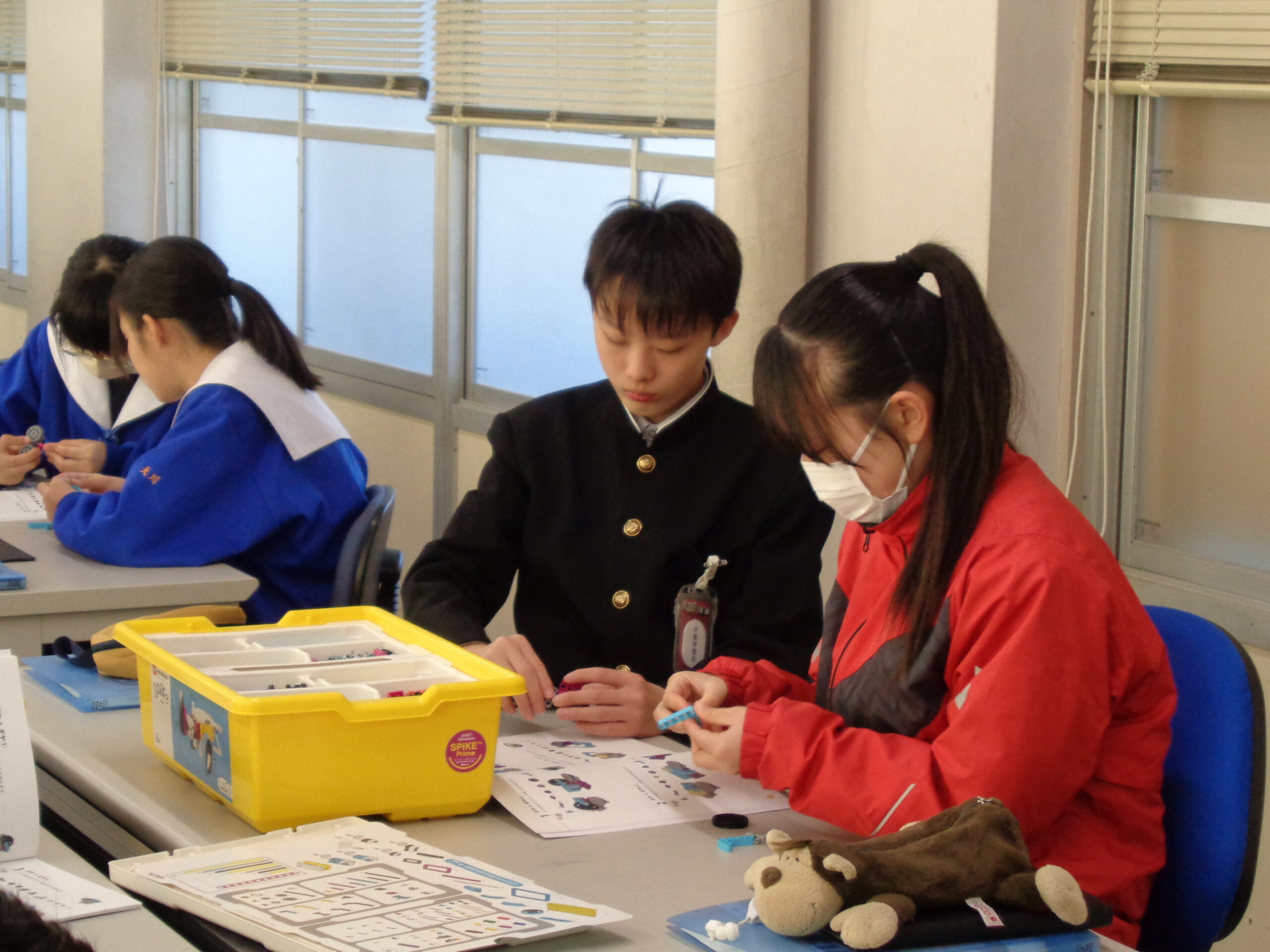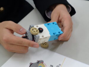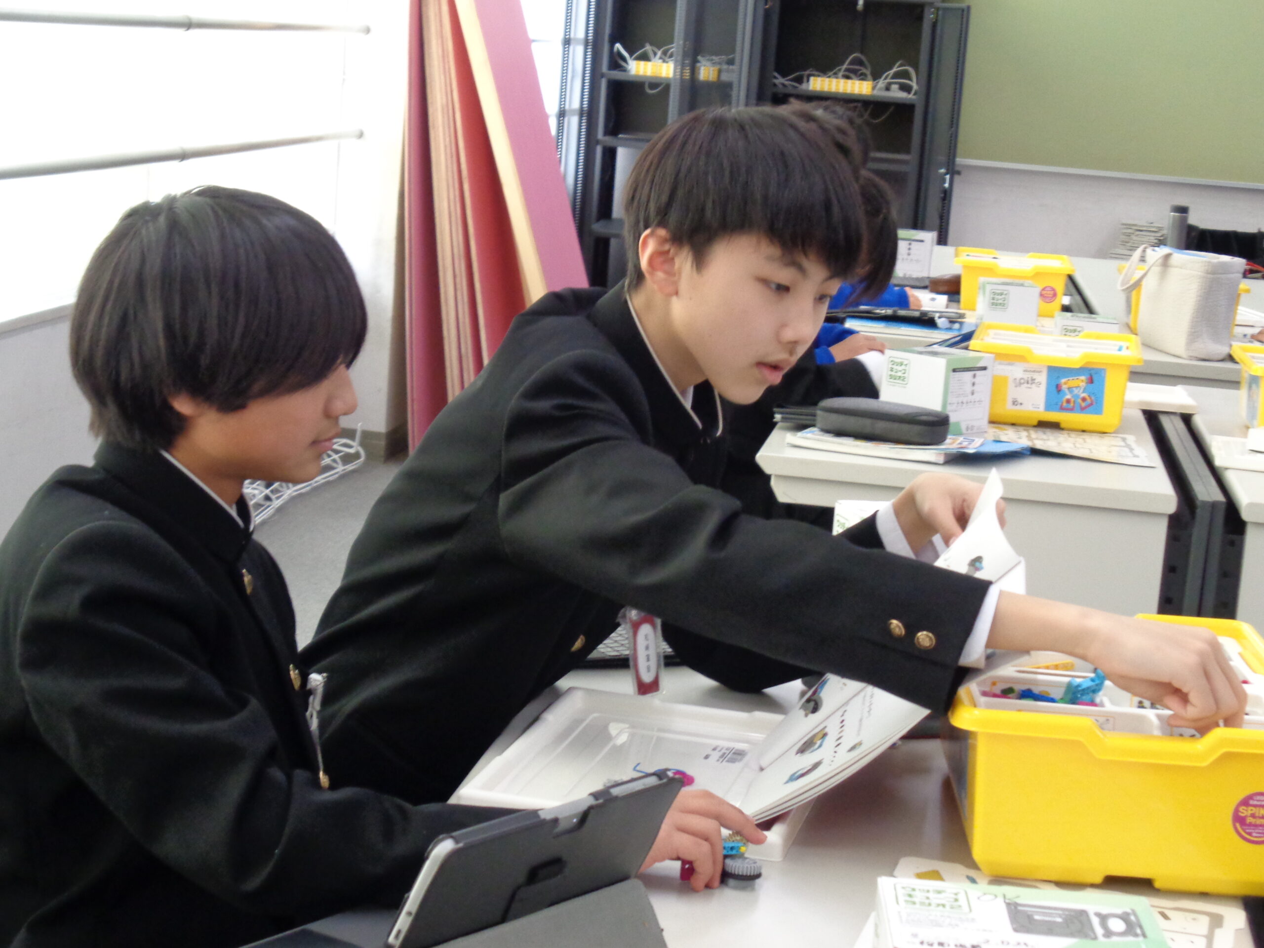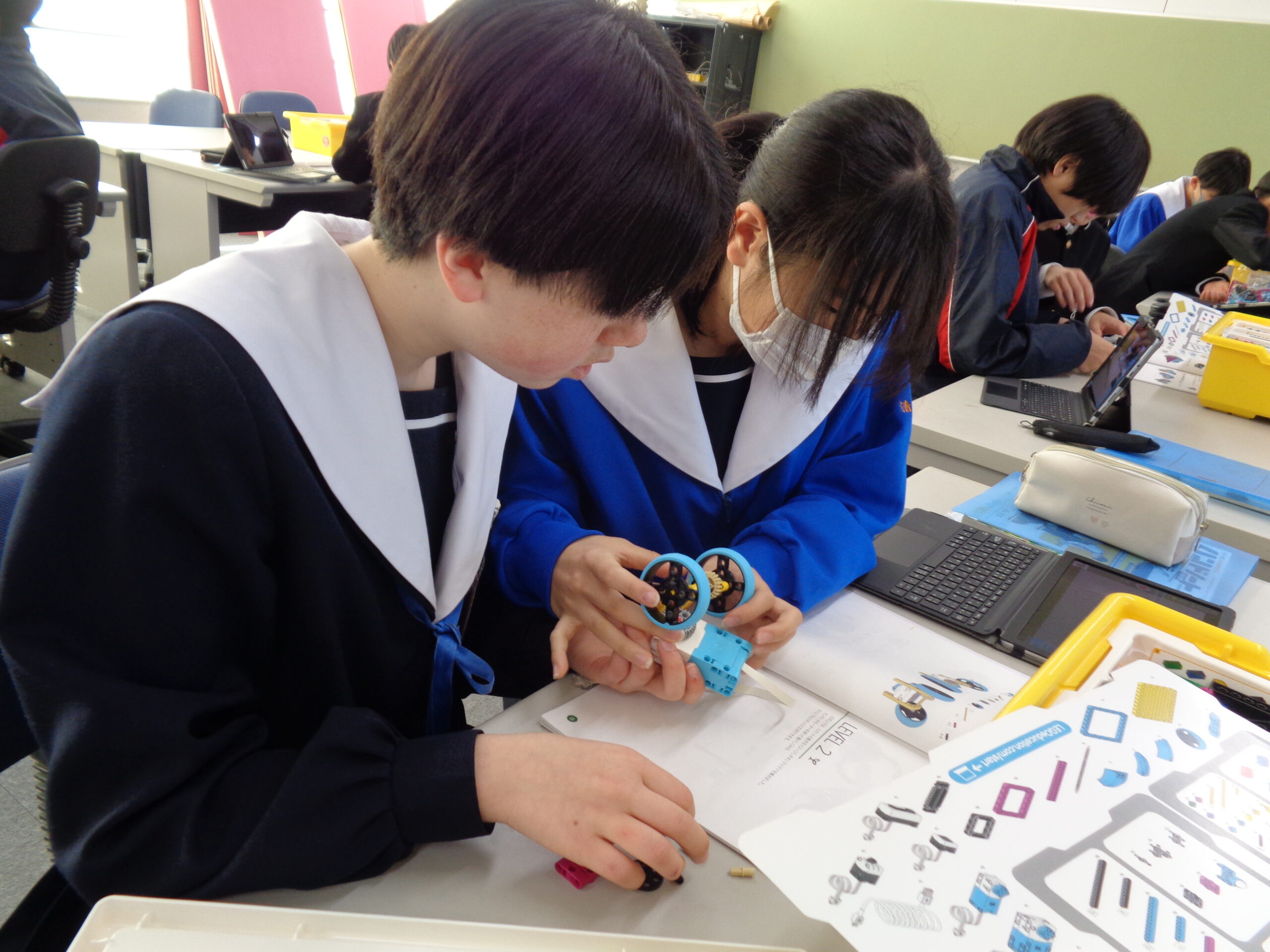 2年生の技術の授業では、「エネルギー変換の技術」について学習しています。今日は、レゴを活用し、モーターの回転運動を「歩く」といった別の動きへ変換する模型製作に挑戦しました。生徒たちは、イラストを見て、試行錯誤しながらギヤ(歯車)を組み合わせました。組み立て終わると、実際に動かしてみました。