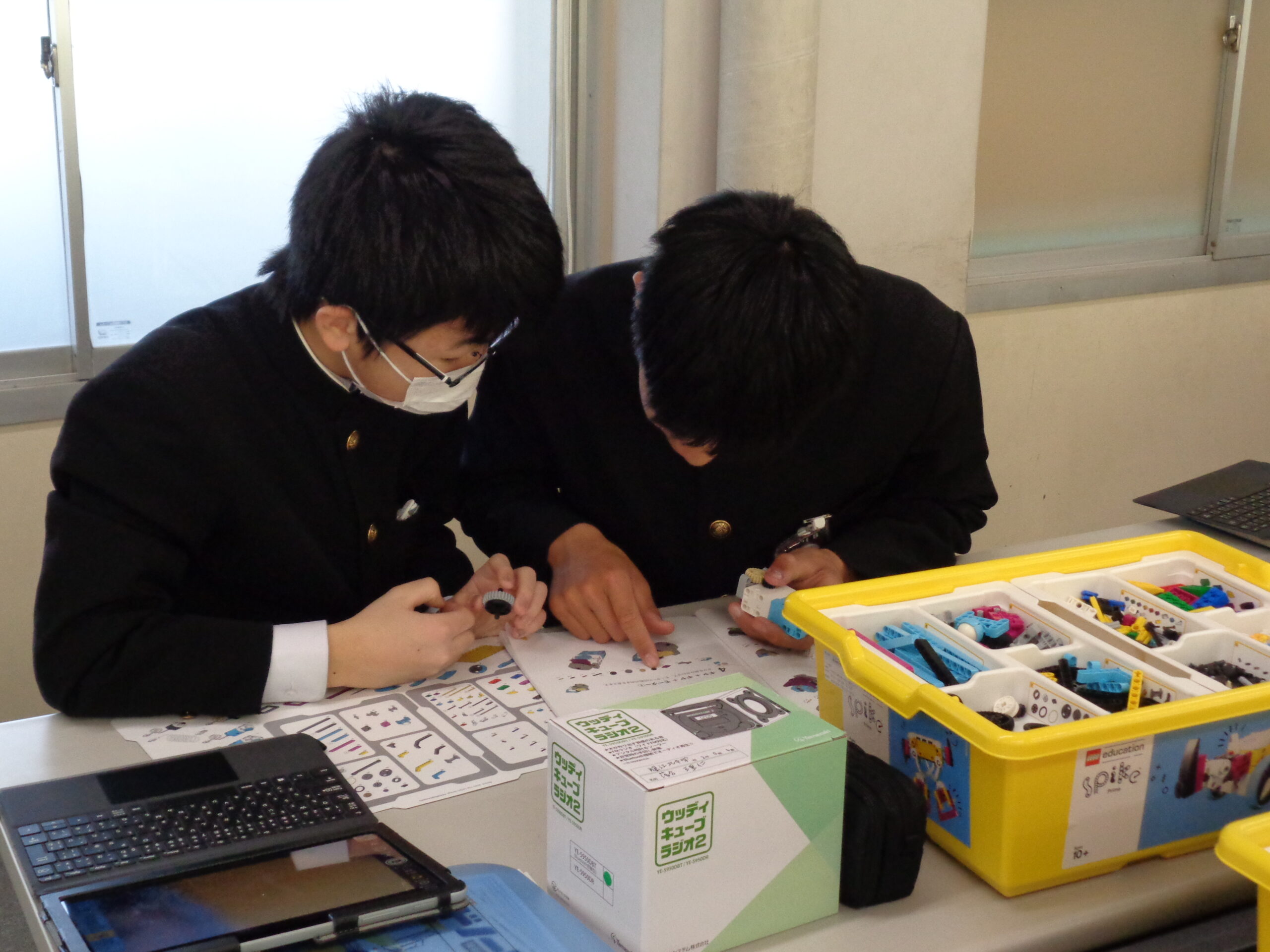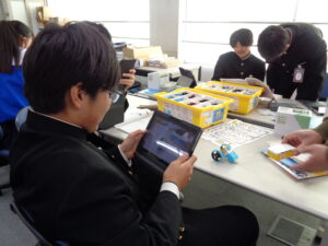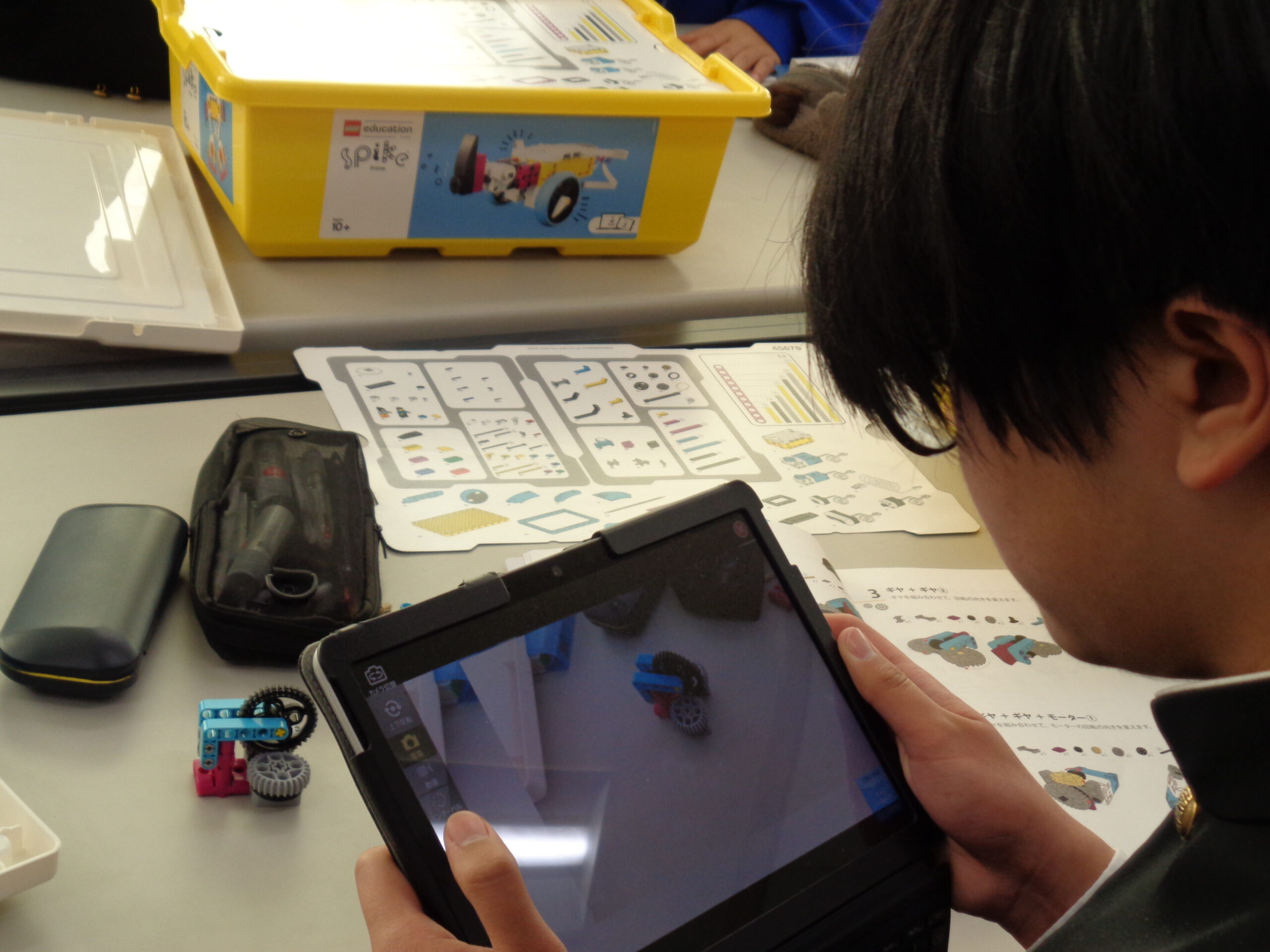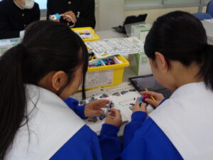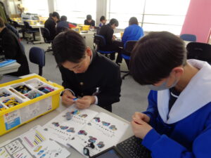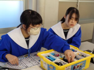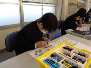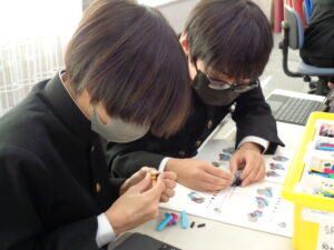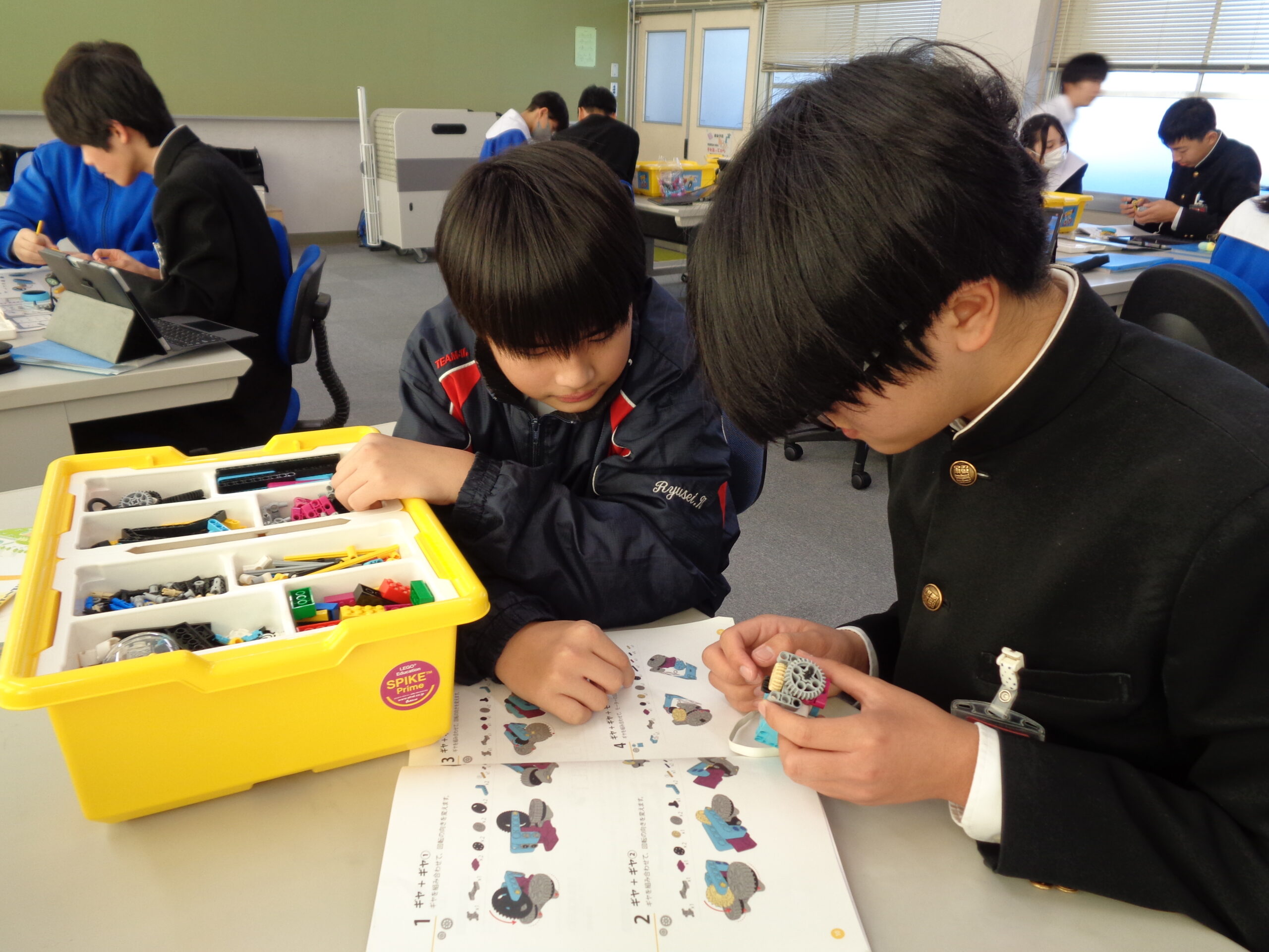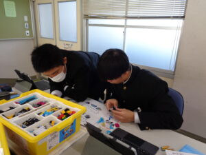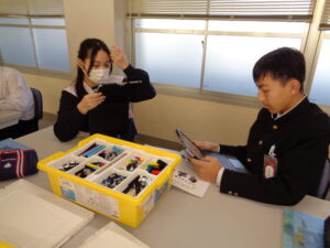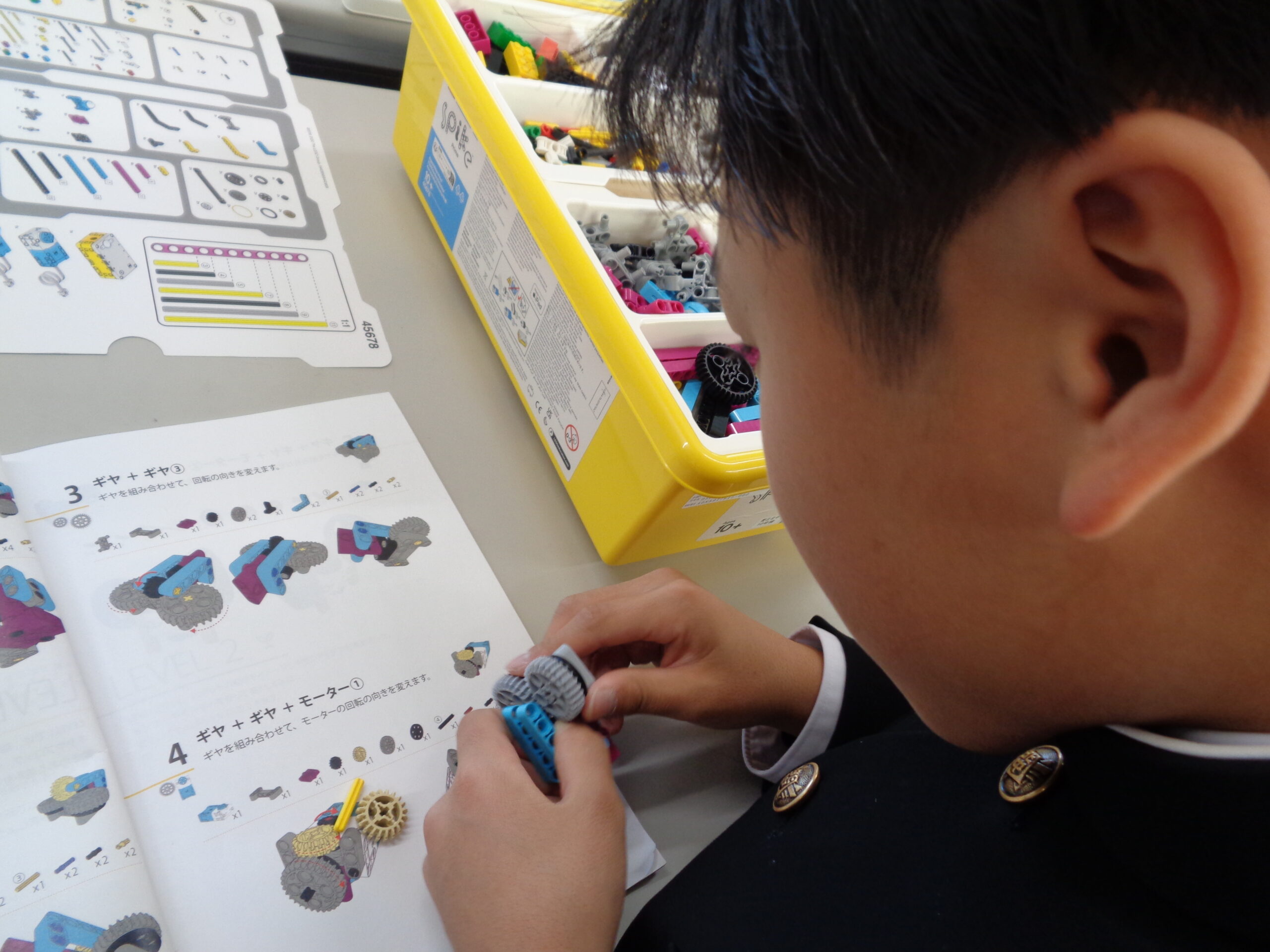 2年生の技術の授業では、「エネルギー変換の技術」について学習しています。今日は、レゴを活用し、モーターの回転運動を「歩く」といった別の動きへ変換する模型製作に挑戦しました。生徒たちは、イラストを見て、試行錯誤しながらギヤ(歯車)を組み合わせました。組み立て終わると、実際に動かしてみました。