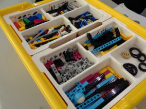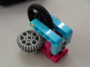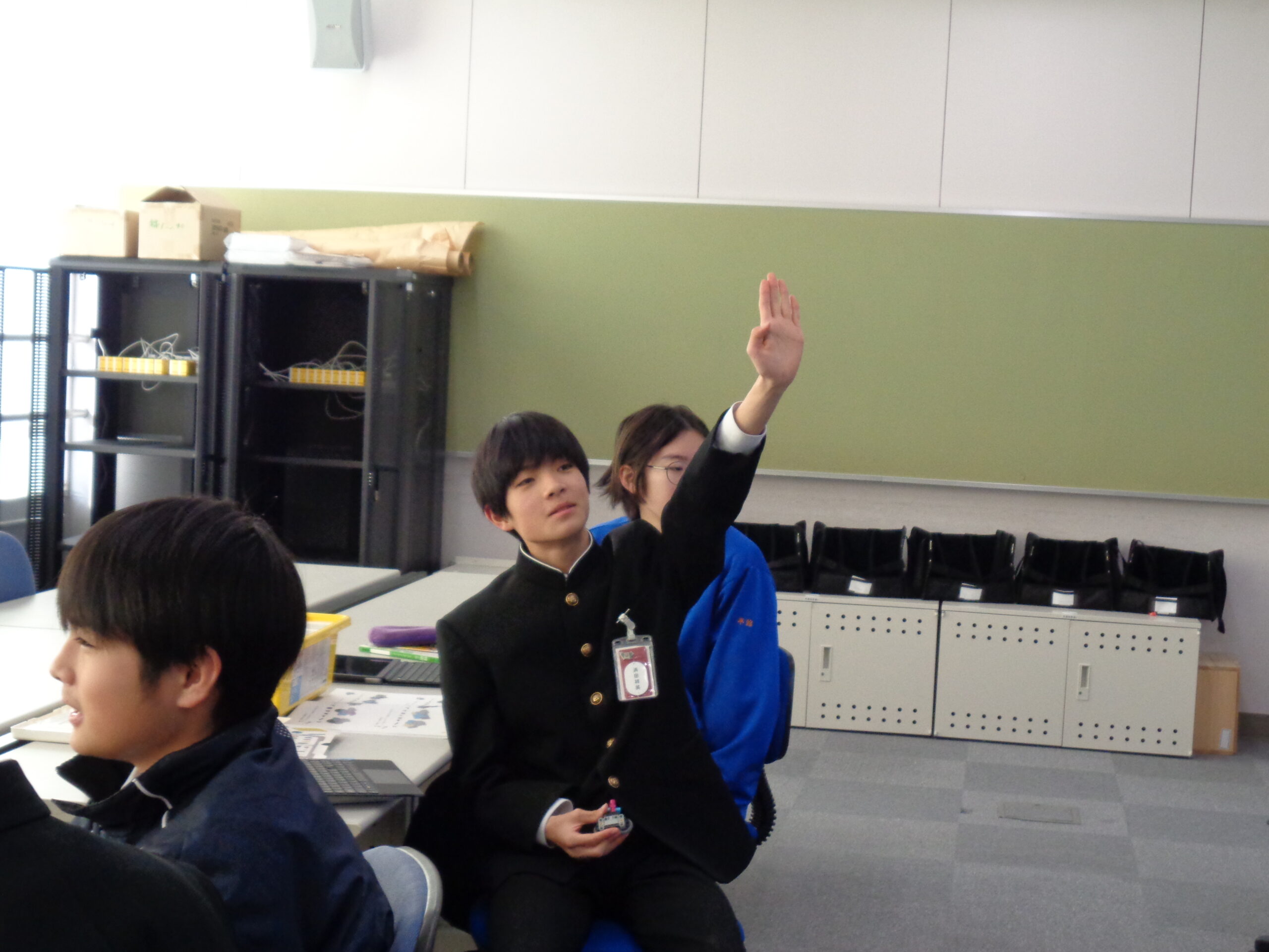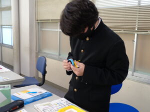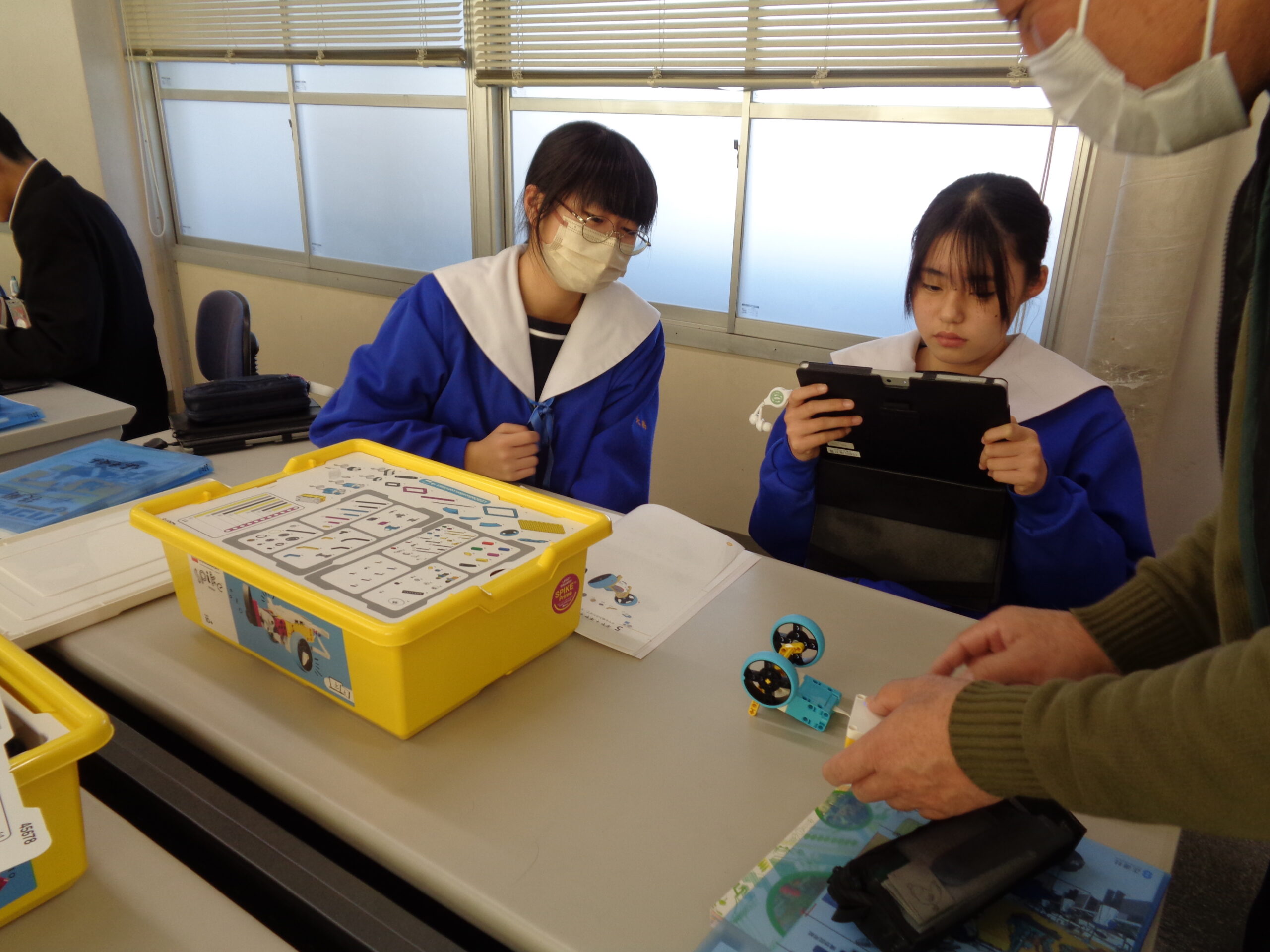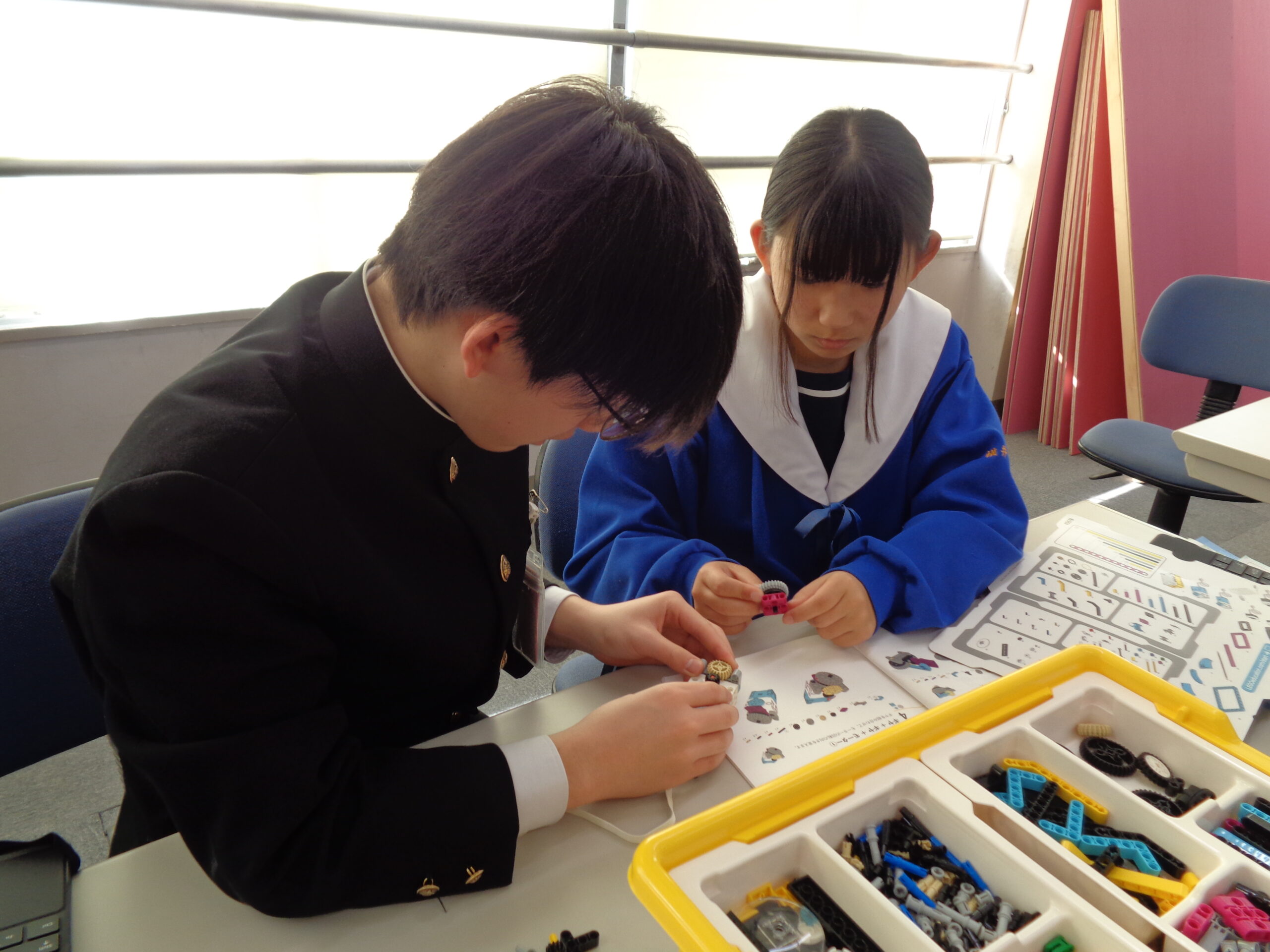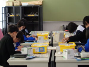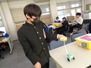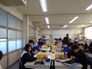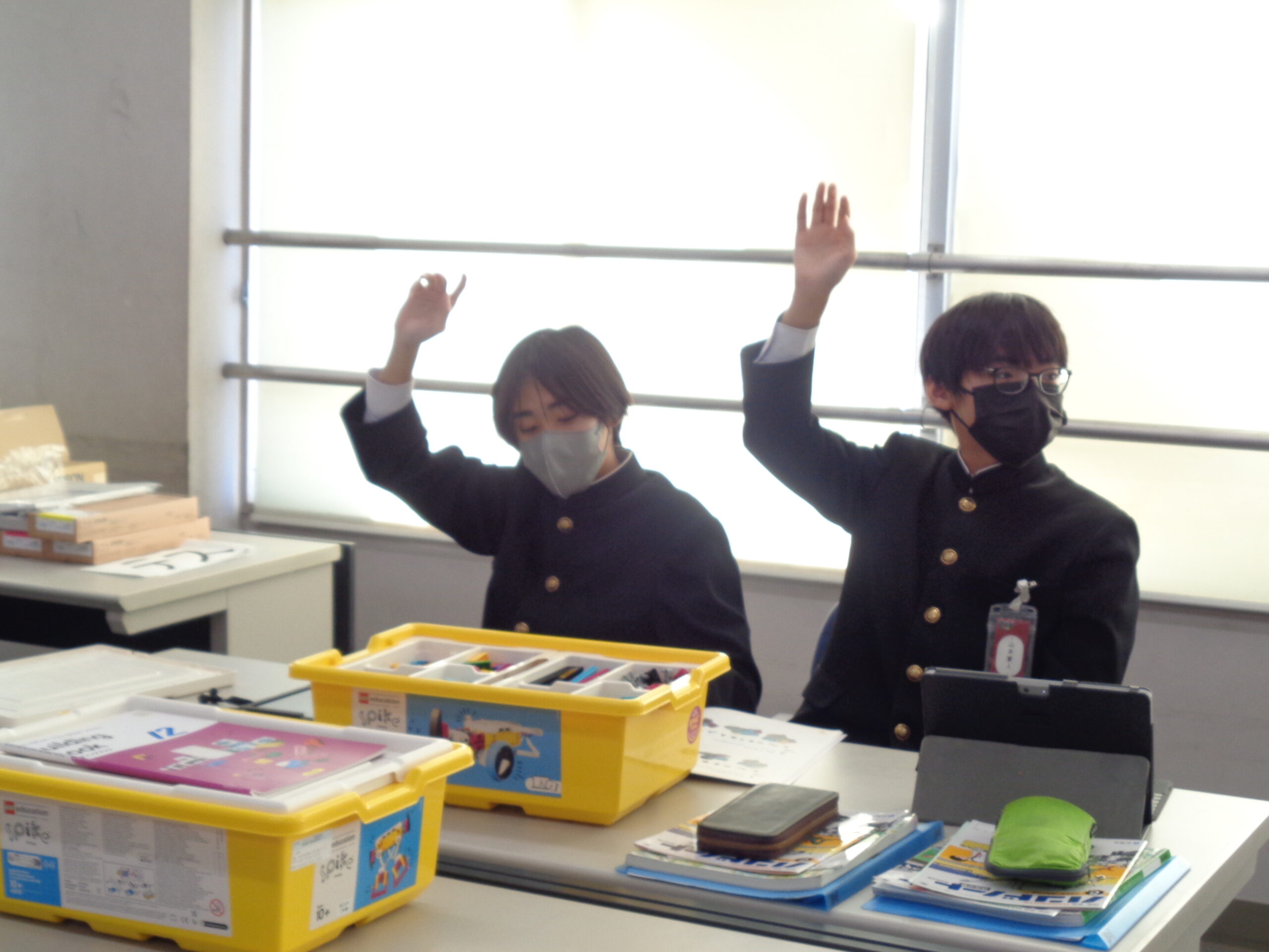 2年生の技術の授業では、「エネルギー変換の技術」について学習しています。今日は、レゴを活用し、モーターの回転運動を「歩く」といった別の動きへ変換する模型製作に挑戦しました。生徒たちは、イラストを見て、試行錯誤しながらギヤ(歯車)を組み合わせました。組み立て終わると、実際に動かしてみました。