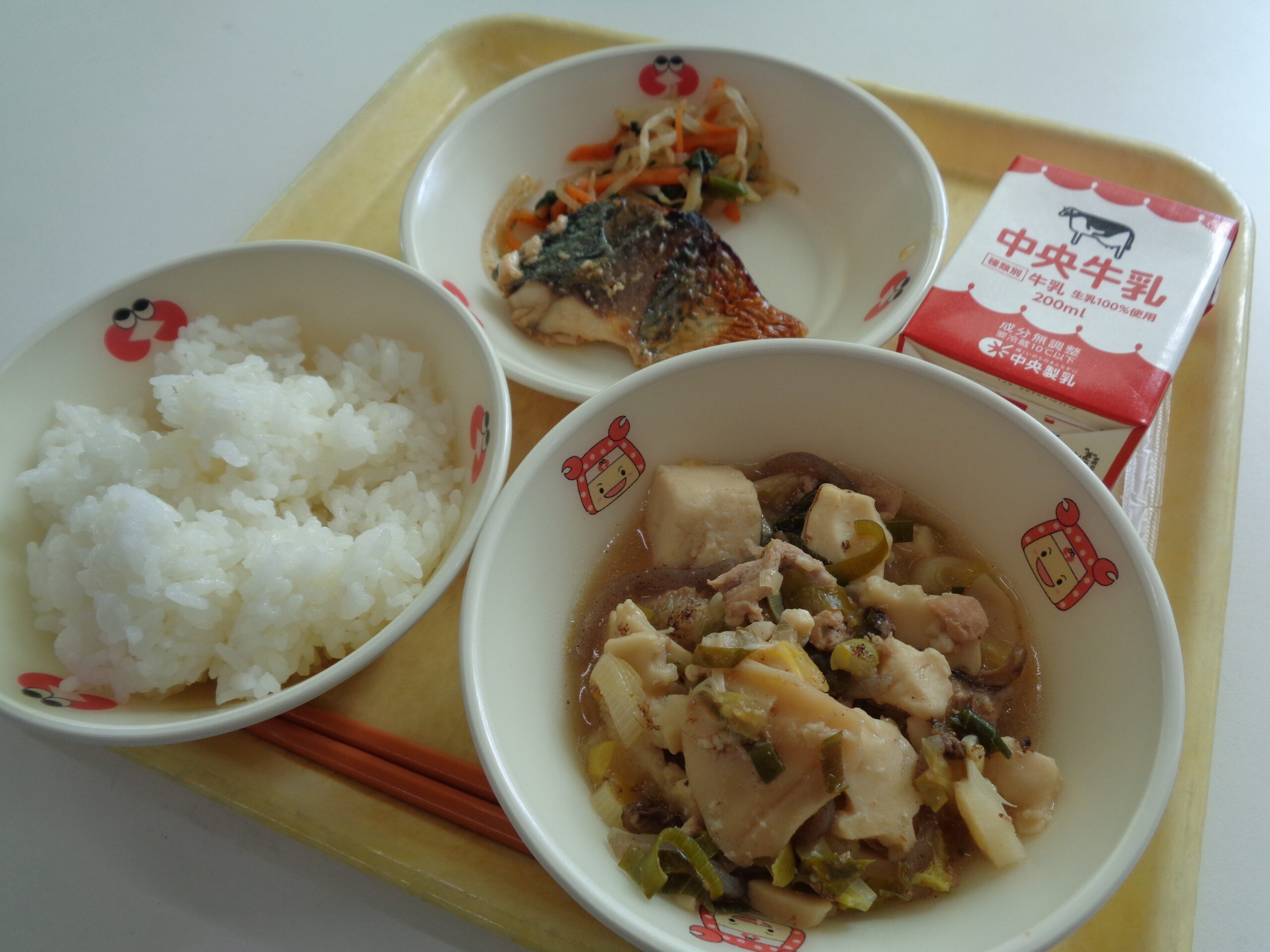 【献立】牛乳 ご飯 肉豆腐 鯖の照り焼き ほうれん草のおかか和え
