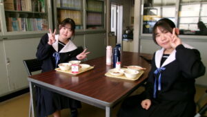 <給食の準備の様子>皆で協力して配膳します。
