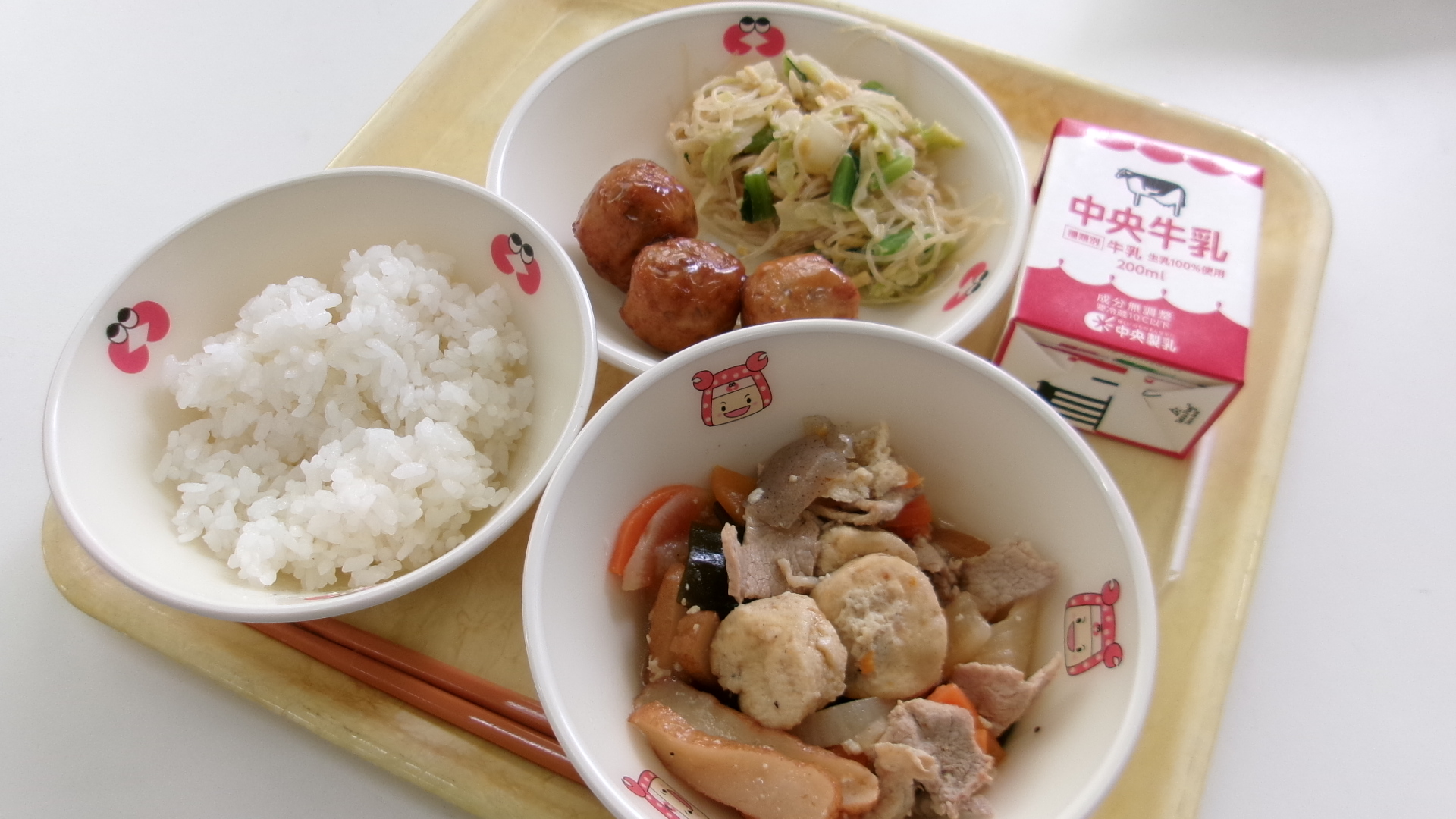 【献立】牛乳 ご飯 関東煮 愛知のレンコン入りつくね 春雨と卵の練りごま和え