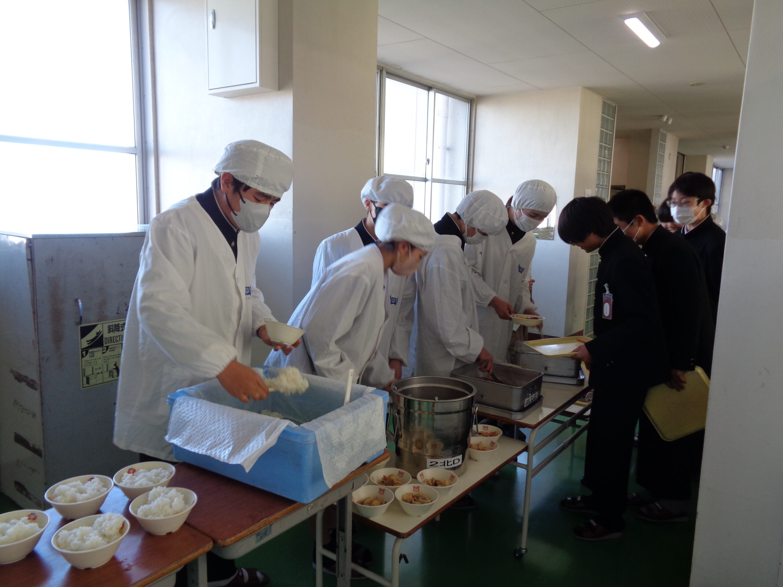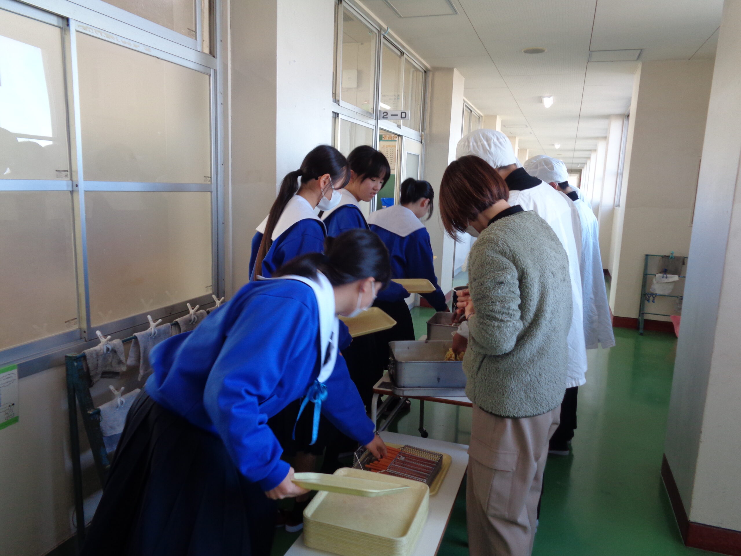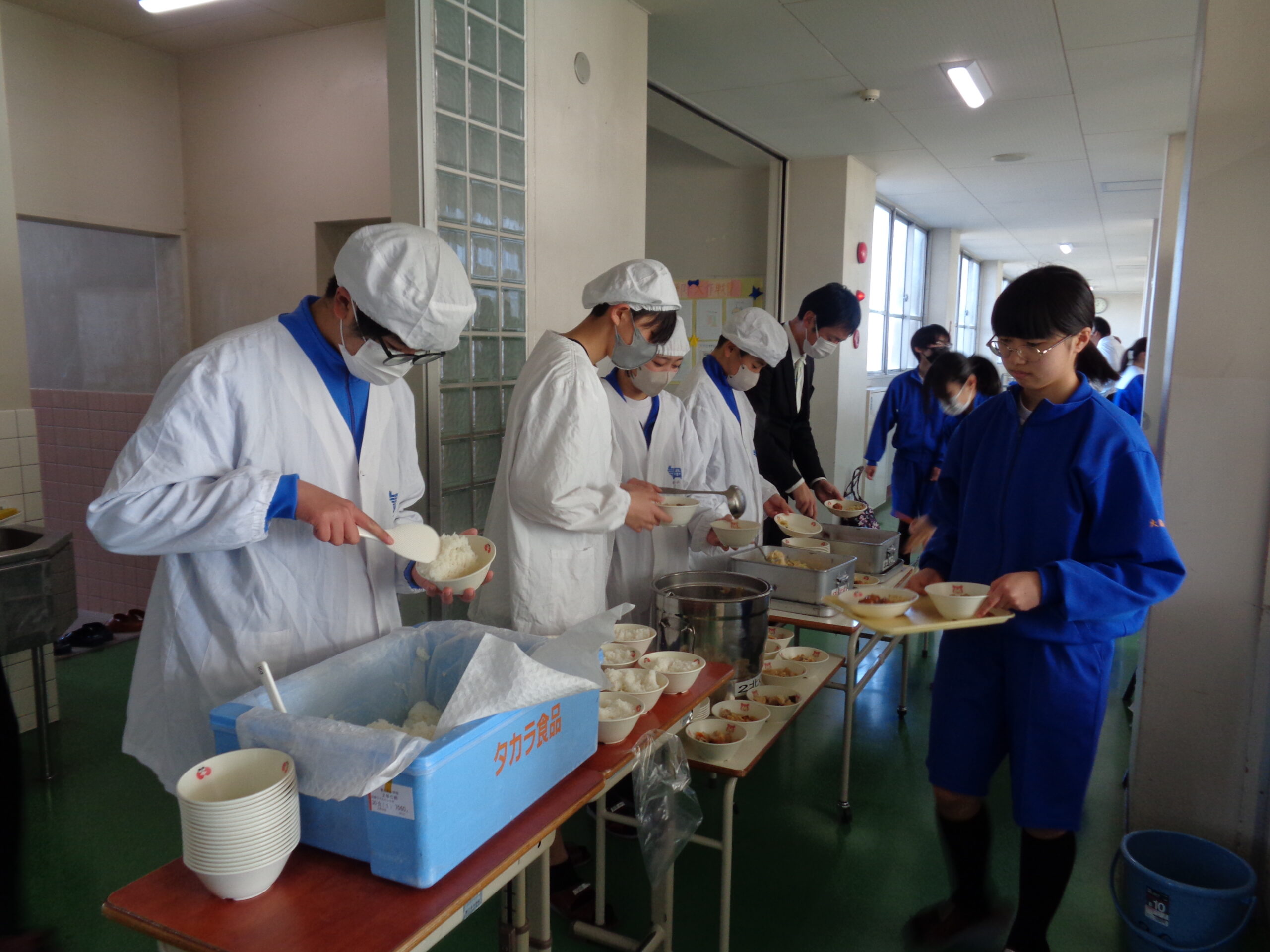 <給食の準備の様子>皆で協力して配膳します。