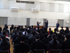 受け取り方、そして証書を受け取る際の高さ、足の運び方などを教師が師範しました。動きの一つも見逃さないという生徒の真剣な眼差し。会場は静寂に包まれました。