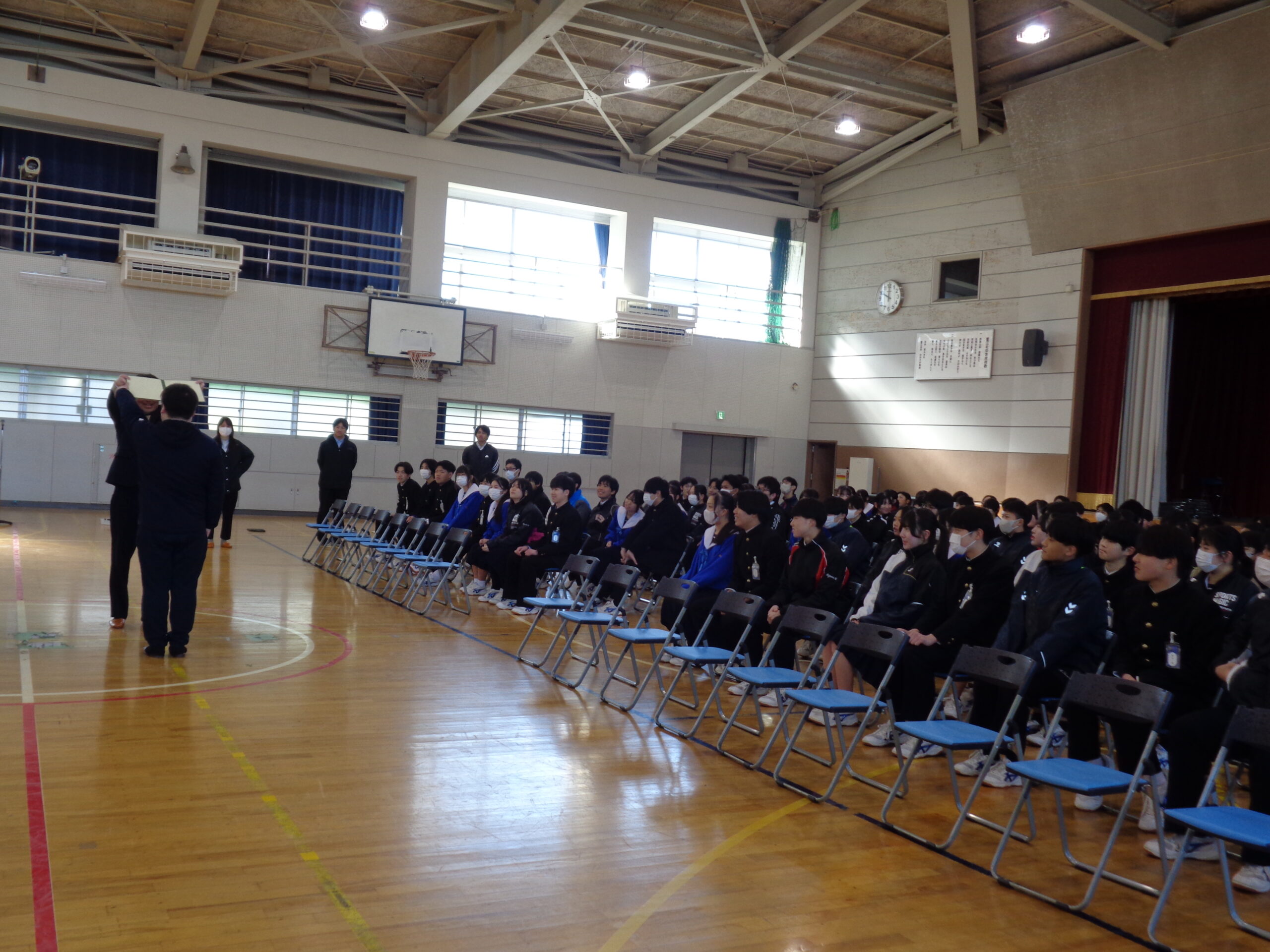 受け取り方、そして証書を受け取る際の高さ、足の運び方などを教師が師範しました。動きの一つも見逃さないという生徒の真剣な眼差し。会場は静寂に包まれました。