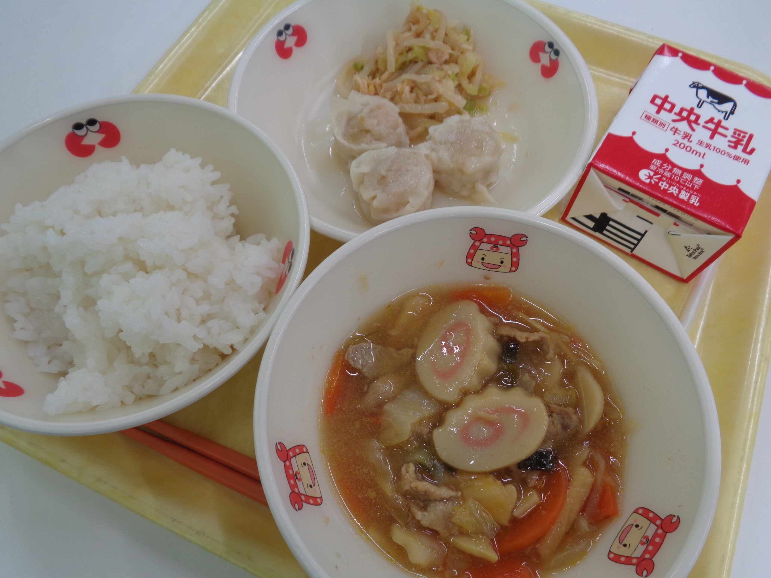 【献立】牛乳 ご飯 八宝菜 エビ焼売 もやしのナムル
