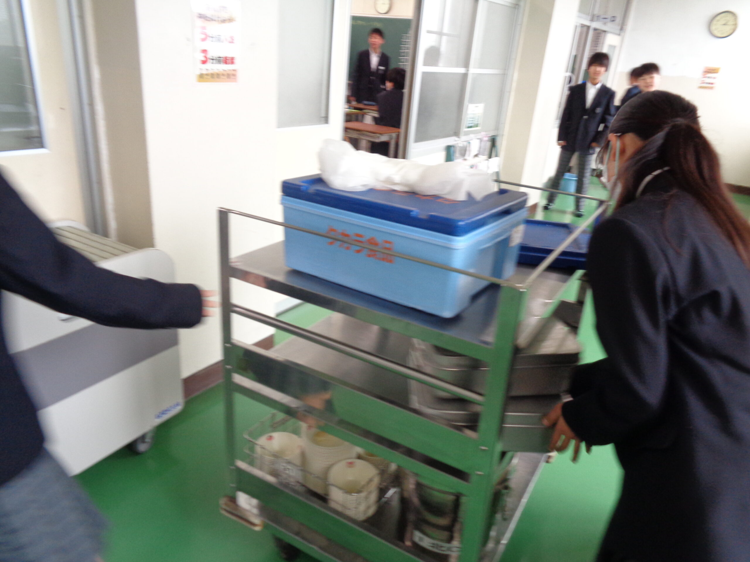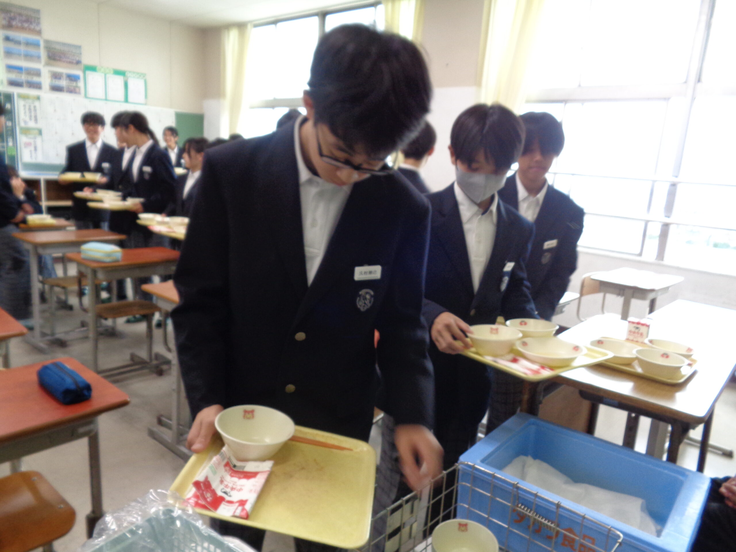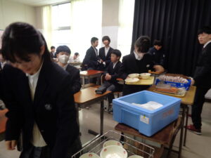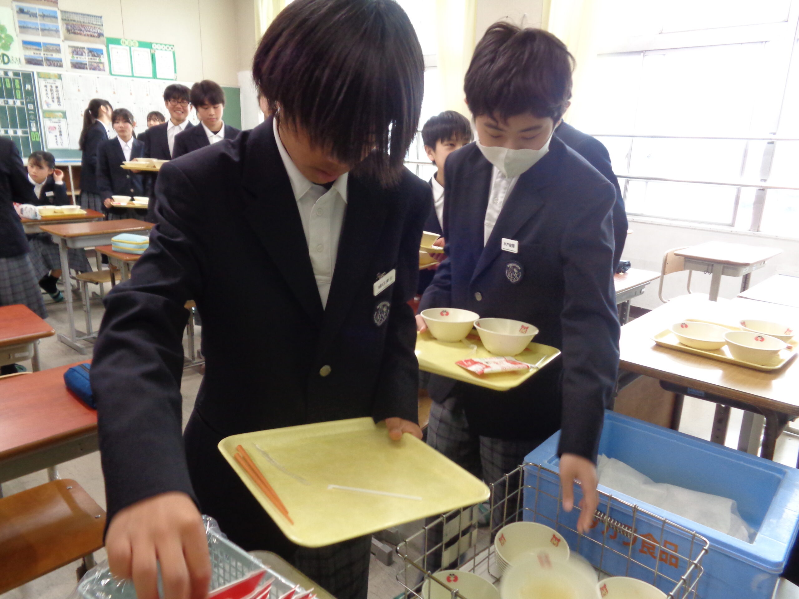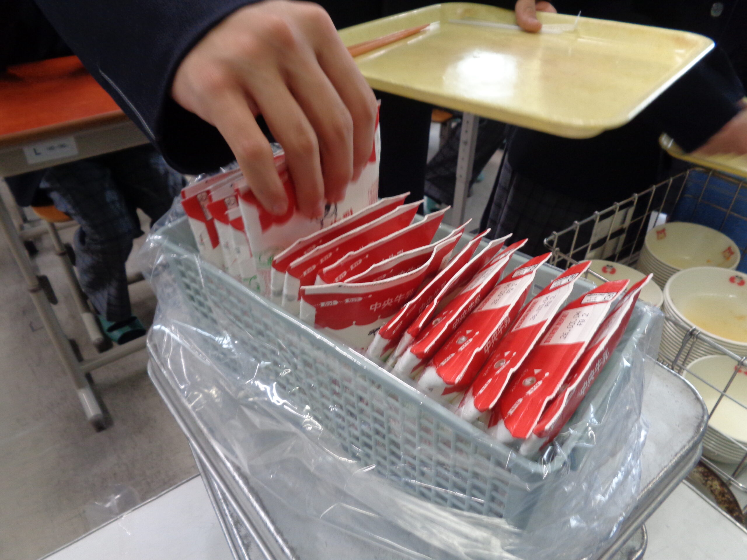 今日も、完食‼給食を食べ終わった後は、配膳員の方や給食センターの方々のことも考えて、正しく・美しく片付けます!食器を種類ごとに分けて、重ねていきます。箸の方向をすべて一定に揃え、量が均等になるようにカゴの中に入れていきます。牛乳パックは、平らにして片付けます。最後に給食当番がワゴンに食器のカゴなどを片付けます。仕上げは、机の水拭きです。
