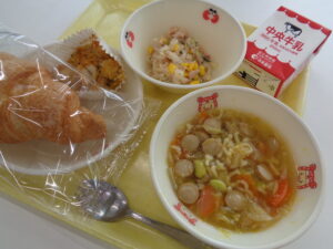 【献立】牛乳 クロワッサン アルファベットスープ 鱈のパン粉焼き 大根サラダ
