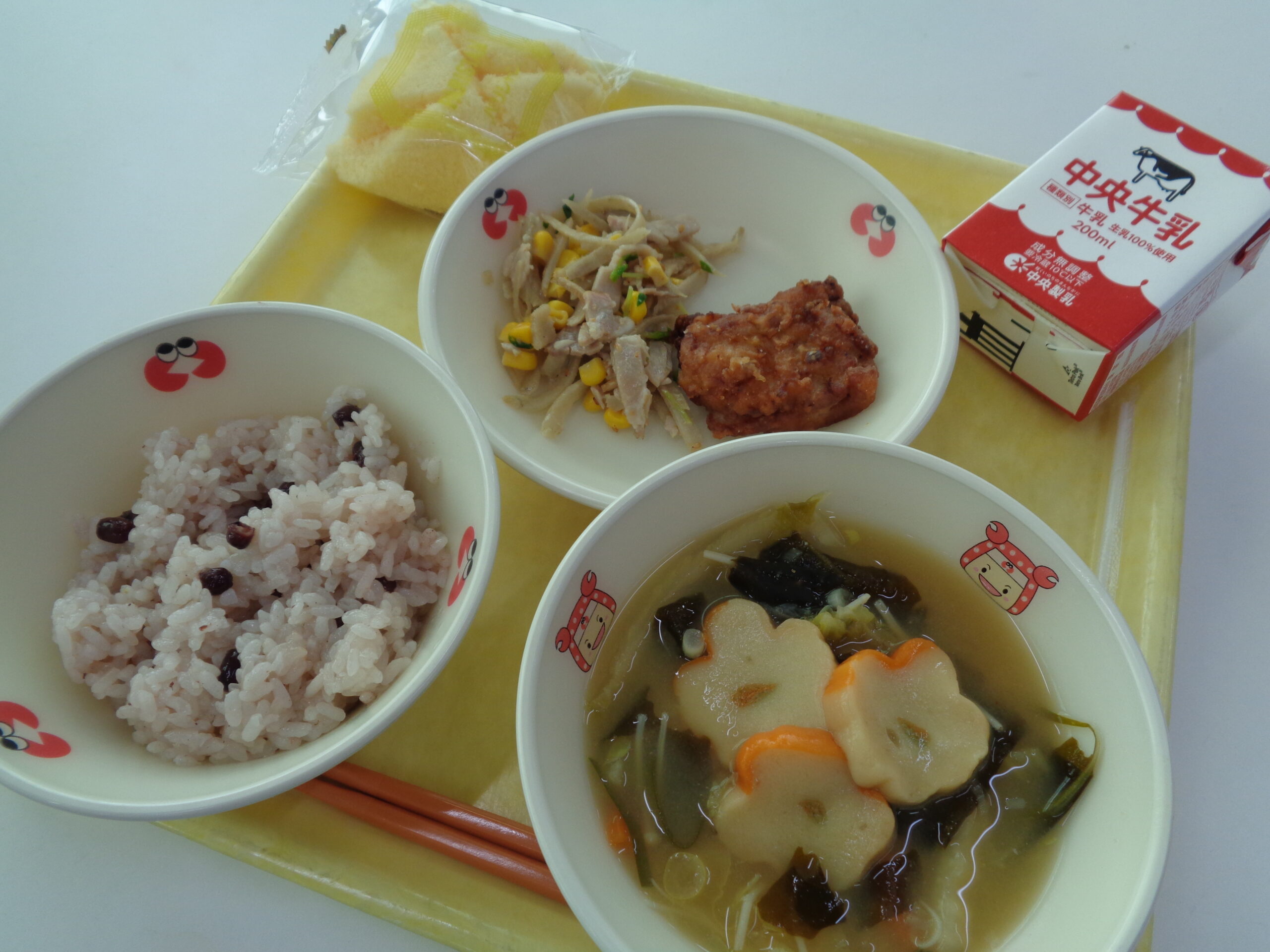 【献立】牛乳 赤飯 花麩の味噌汁 鶏の竜田揚げ ごぼうサラダ お祝いバースデーデザート「パリジャン」