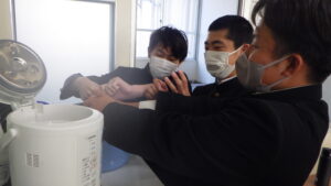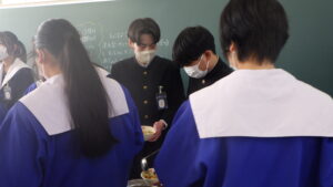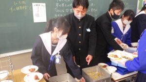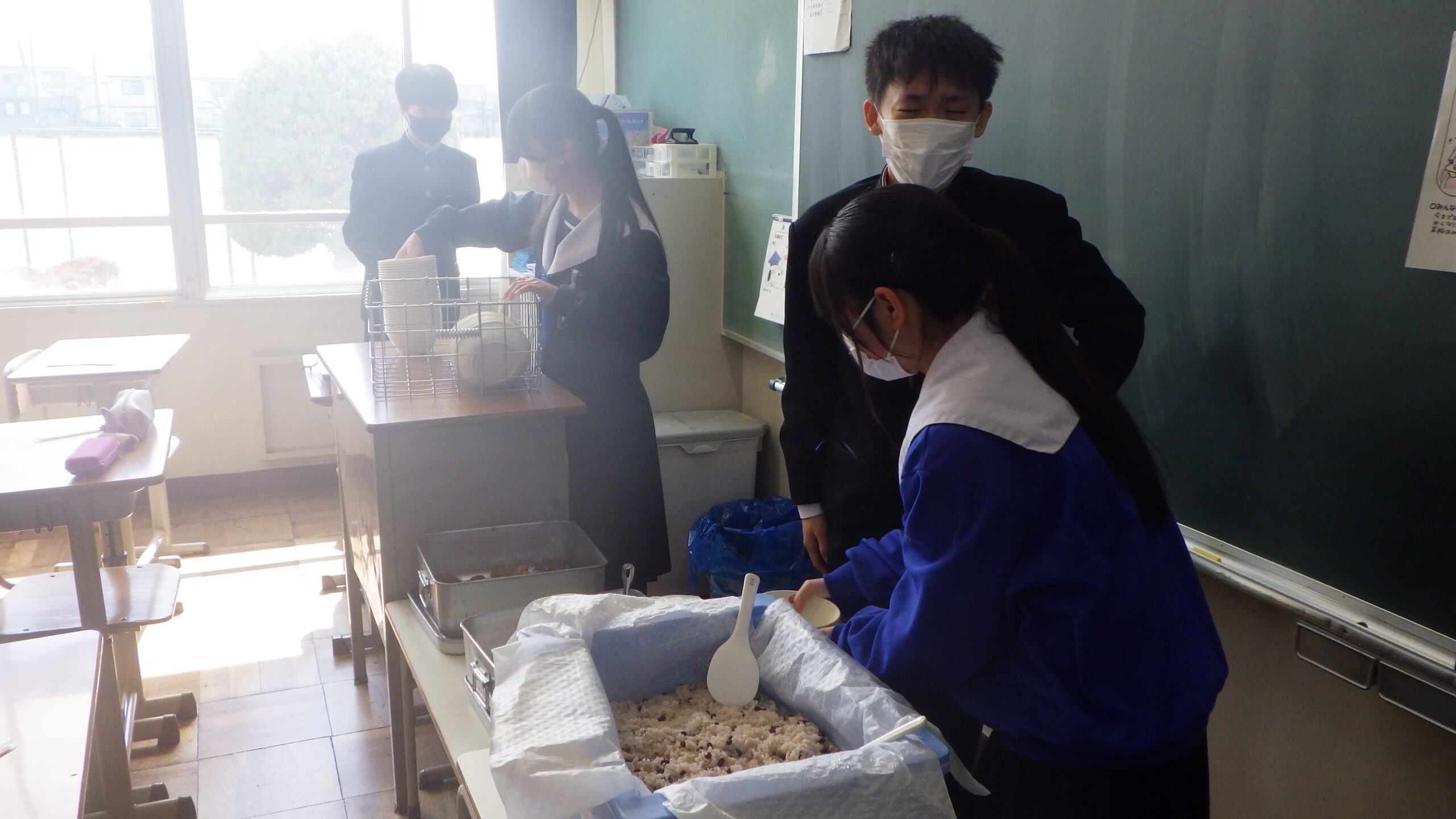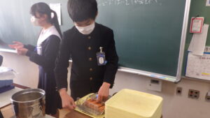 今日は、中学校3年生最後の給食です。給食センターでは、3年生の皆さんにお祝いの気持ちをこめて「赤飯」を用意してくださいました。赤飯は、お祝い事があるときに日本で昔からよく食べられている料理です。もち米を「小豆(あずき)」や「ささげ」という赤色の豆を煮た汁に浸してから作るため、赤色のご飯ができます。赤いものを食べると、悪いものを追い払う力がつくと、昔から伝えられてきました。