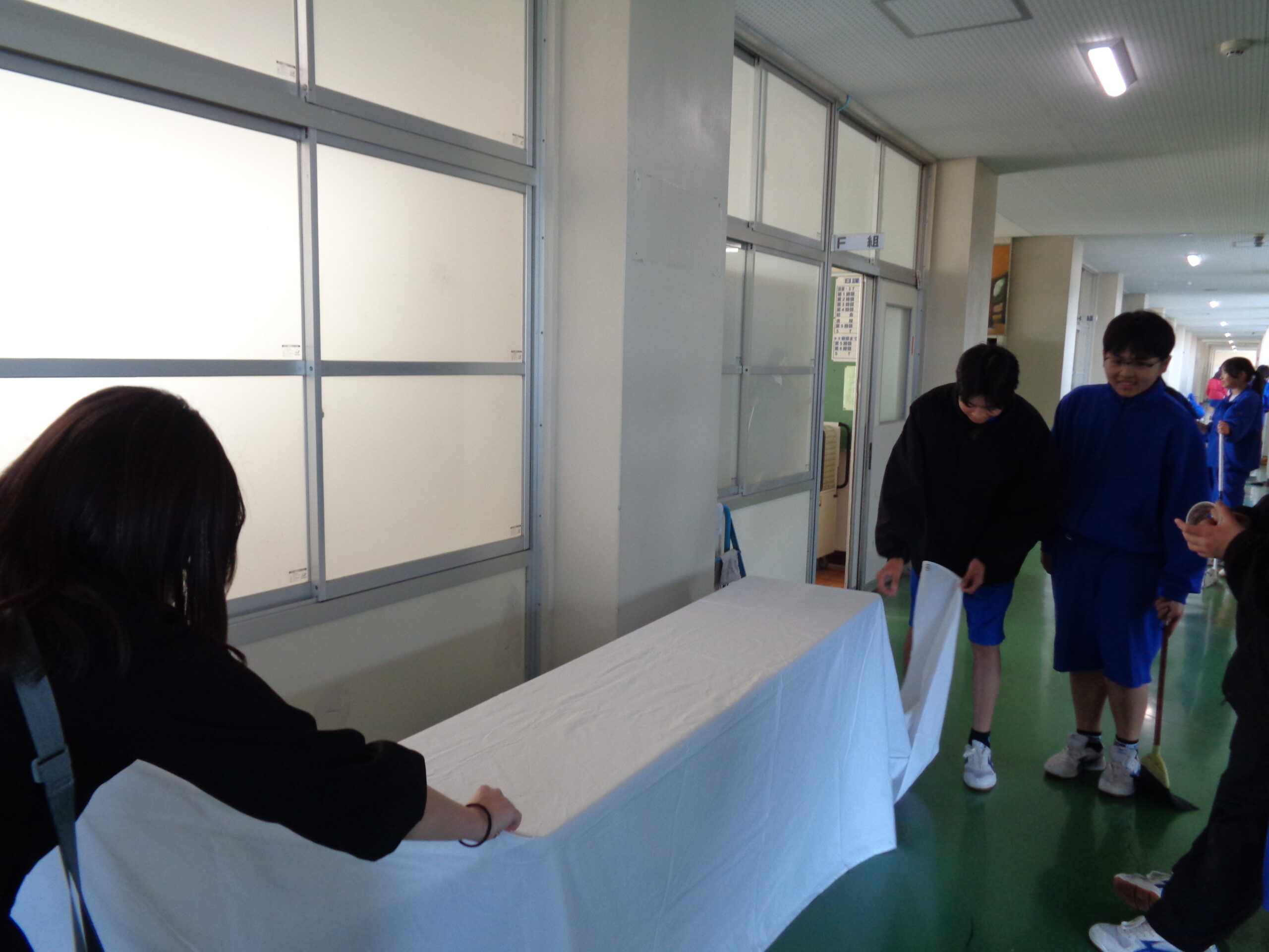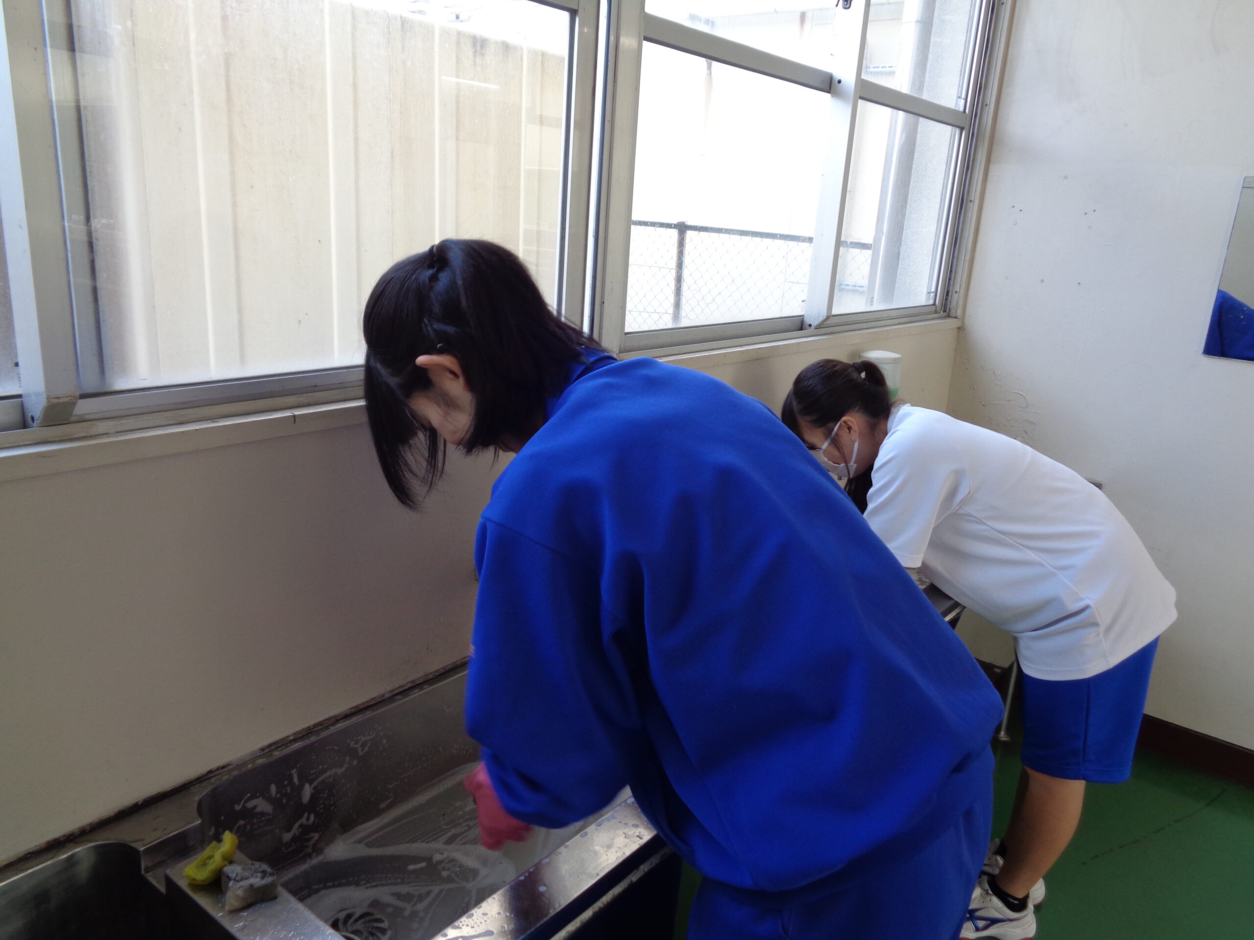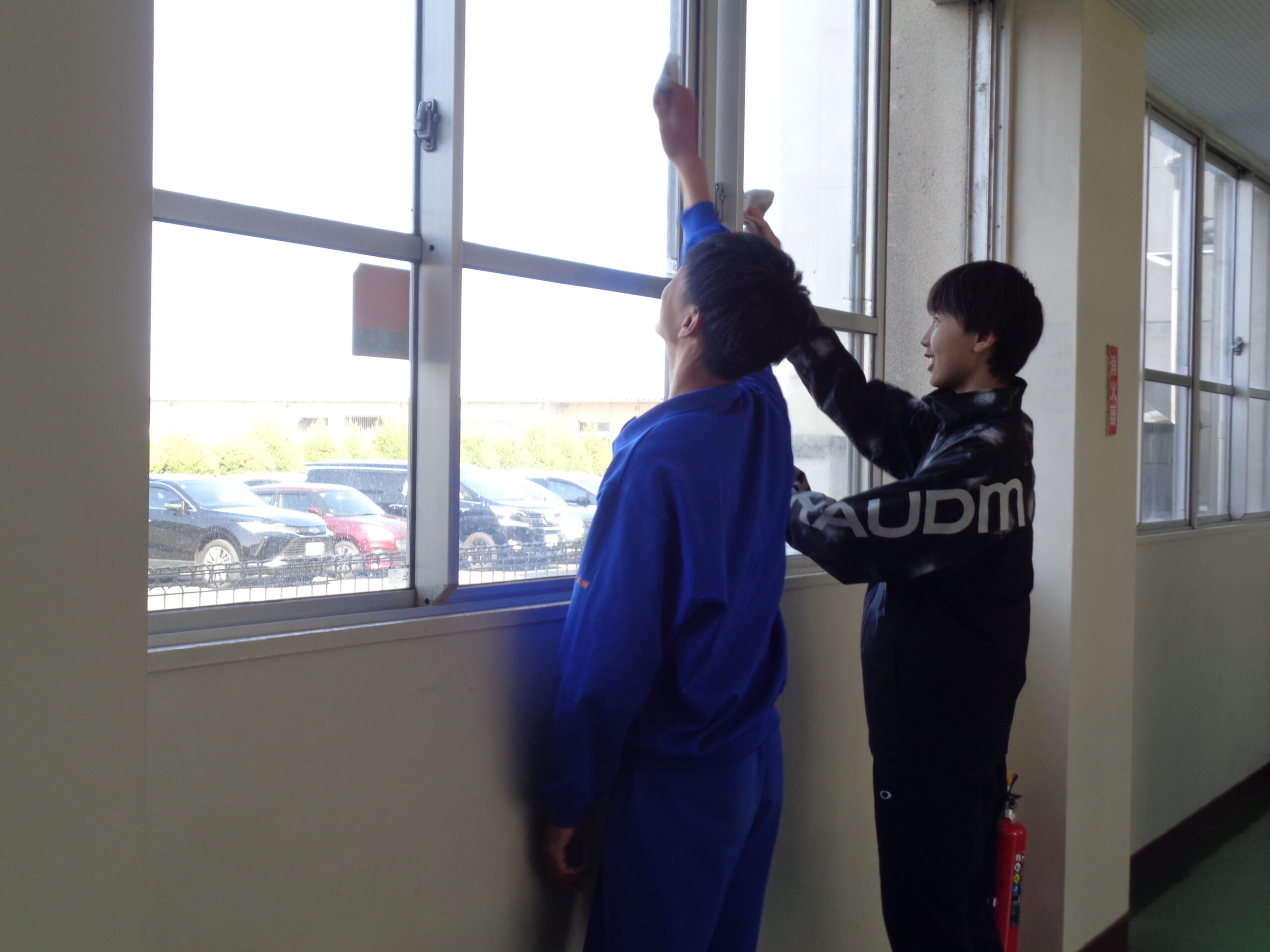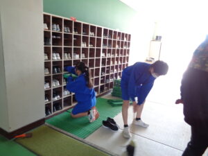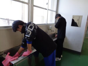 明日の卒業式を前に、午後からは2年生が校内清掃、会場設営などを行いました。これまで学校のリーダーとして引っ張ってくれた3年生に、気持ちよく卒業してほしい。そんな想いが、一人一人の動きに表れていました。 廊下や階段の隅々まで丁寧に雑巾がけをする姿、手洗い場を磨き上げる姿。先輩たちに対して、「自分たちにできる最高のことを!」という気持ちが伝わってきました。