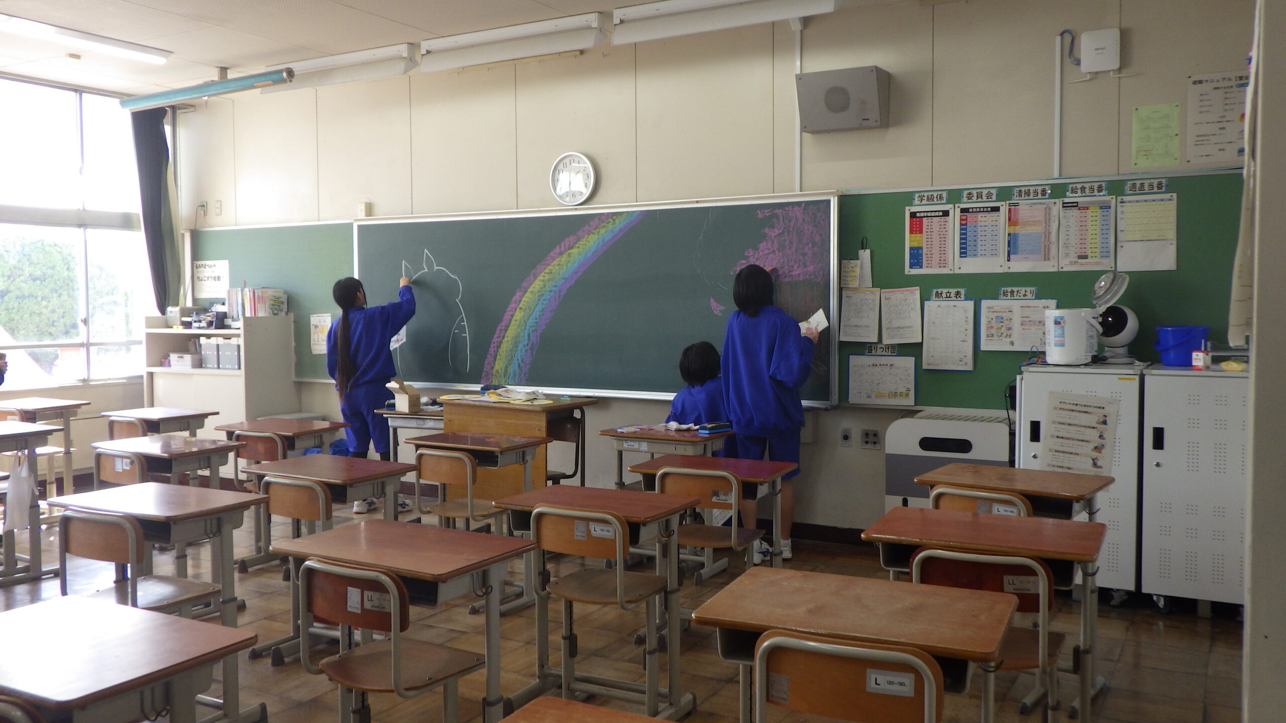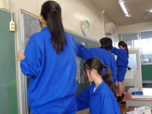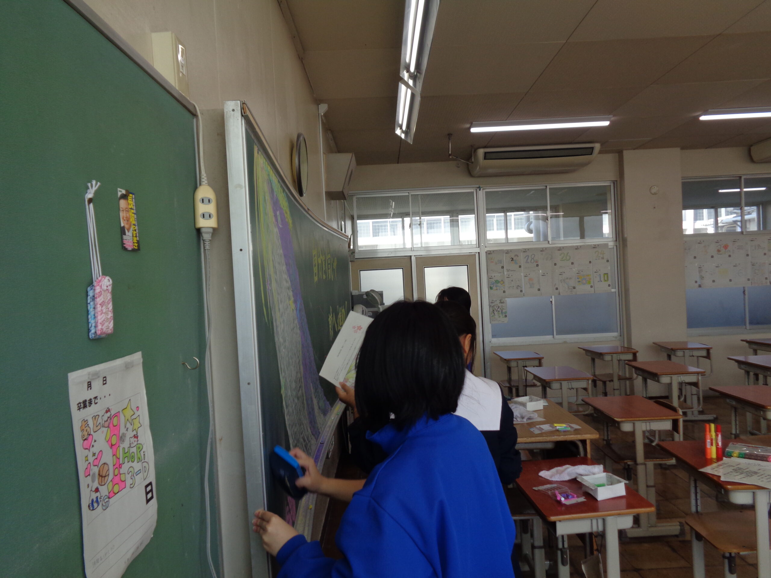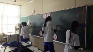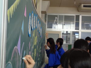 3年生の教室では、黒板アートや飾りつけを行いました。黒板にはお祝いの言葉が並びます。作業の手を止めることなく、それでいて楽しそうに飾りつける2年生。