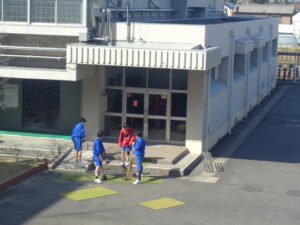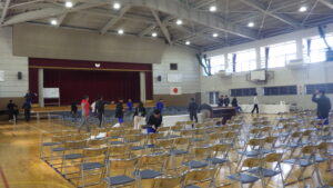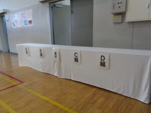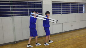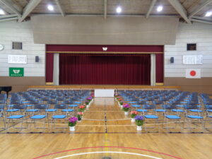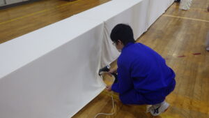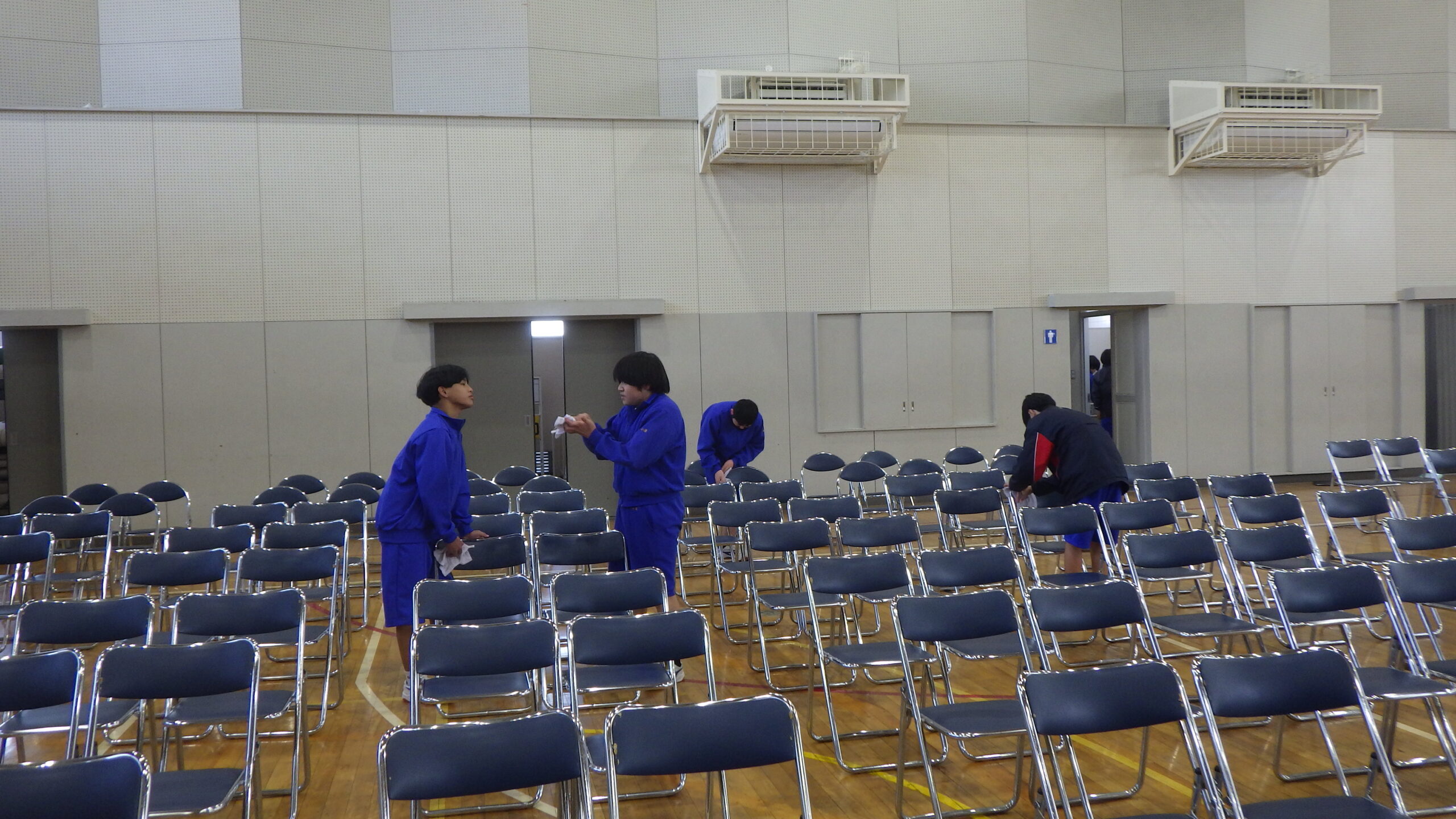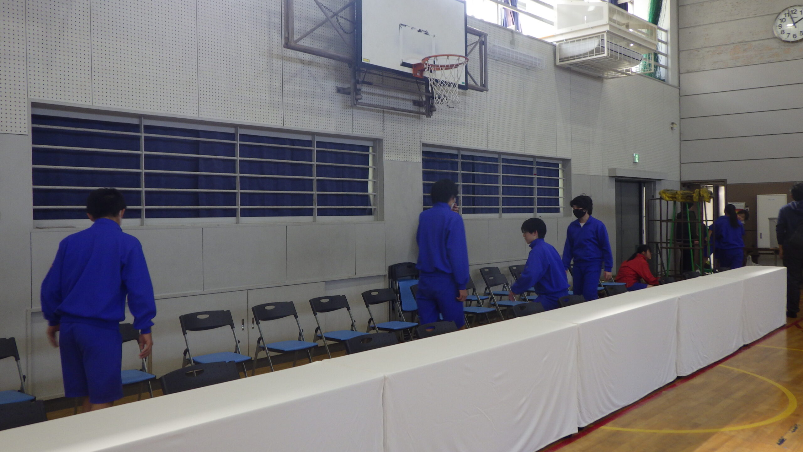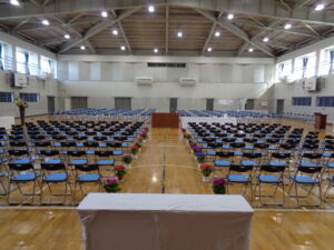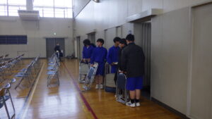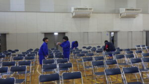 体育館では、先輩たちが座る椅子の設営などを行いました。