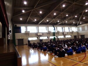 登校3日目、清々しい青空が広がる月曜日の朝。体育館にて「全校朝礼」を行いました。