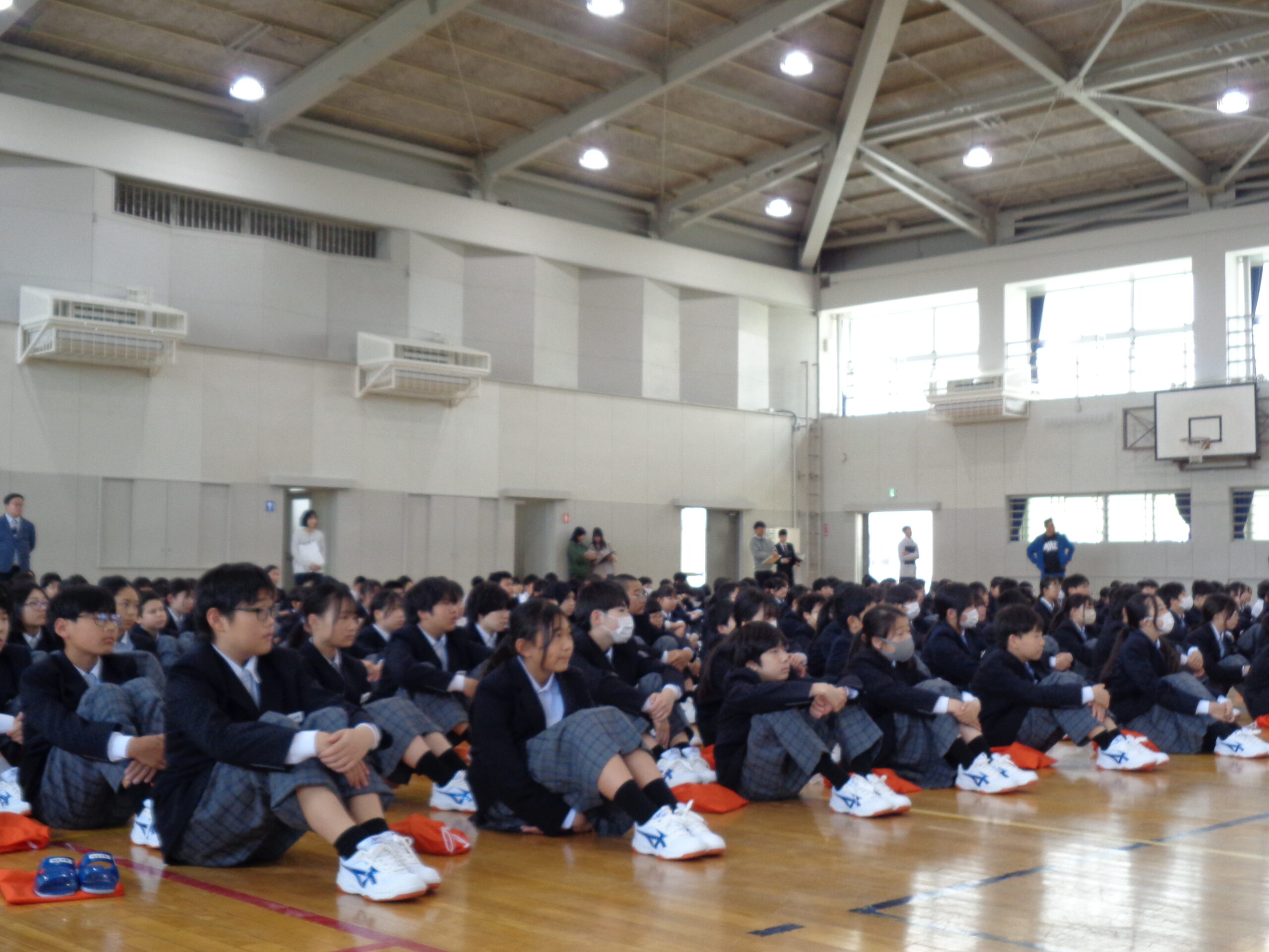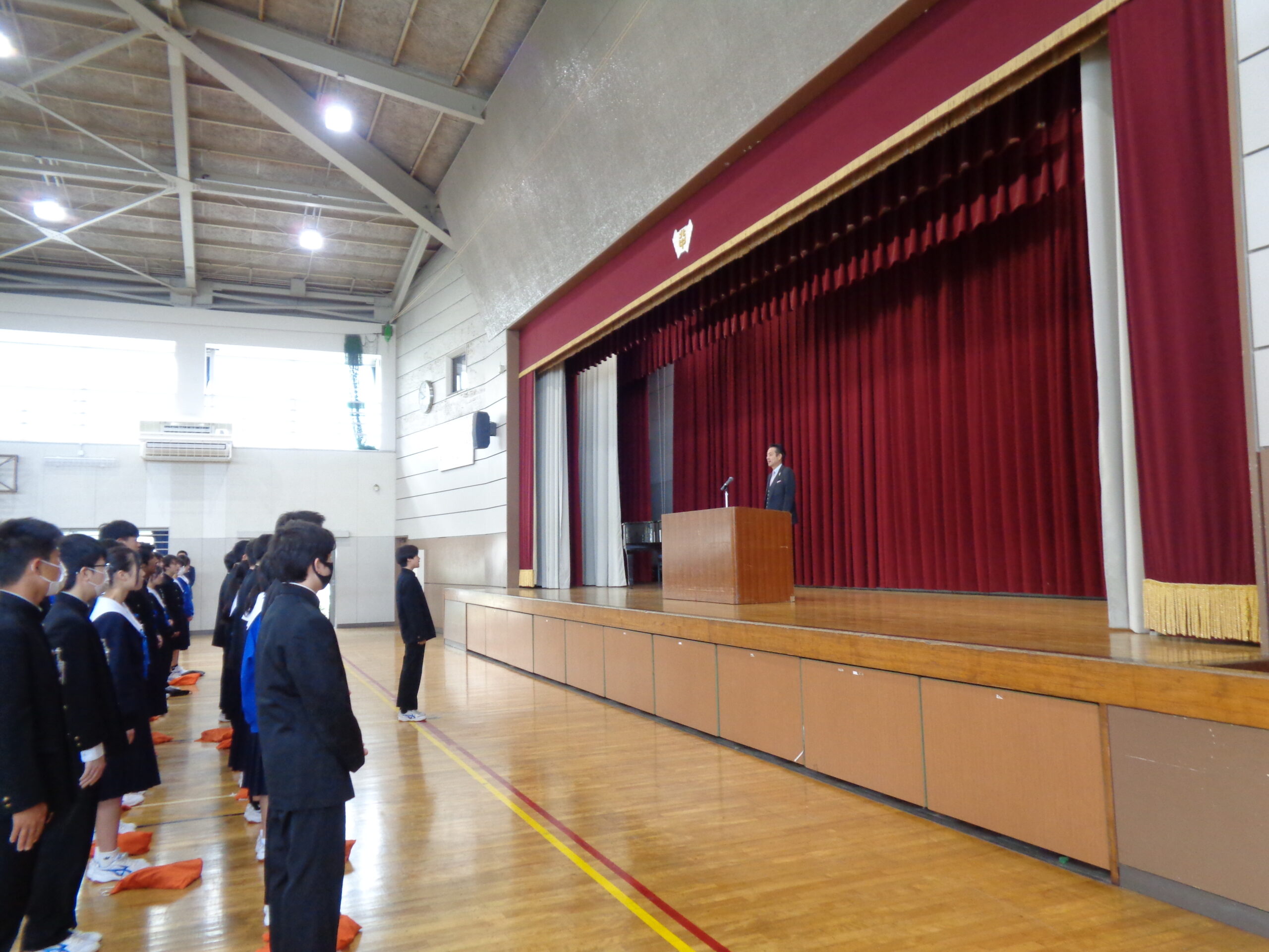 登校3日目、清々しい青空が広がる月曜日の朝。体育館にて「全校朝礼」を行いました。