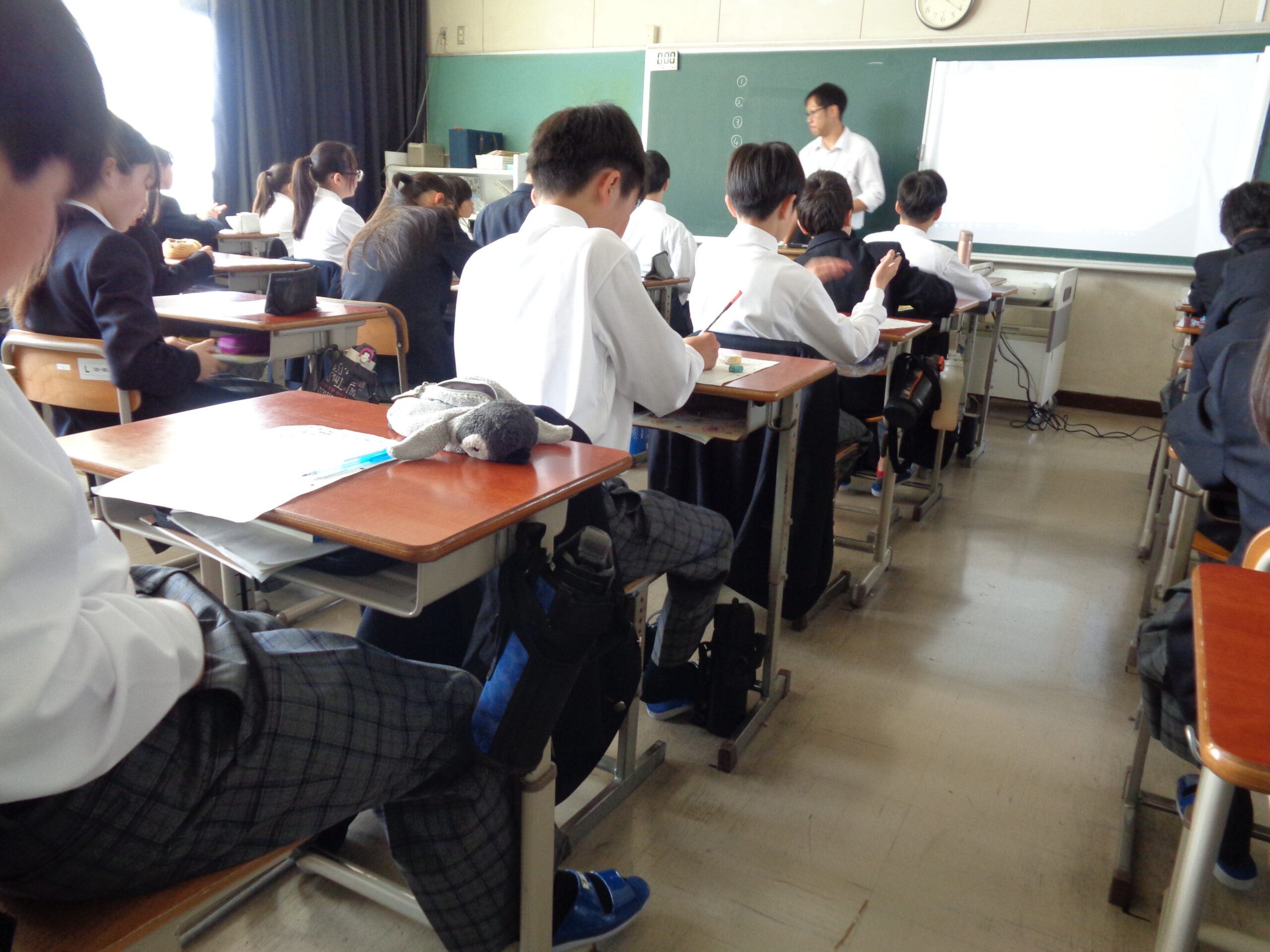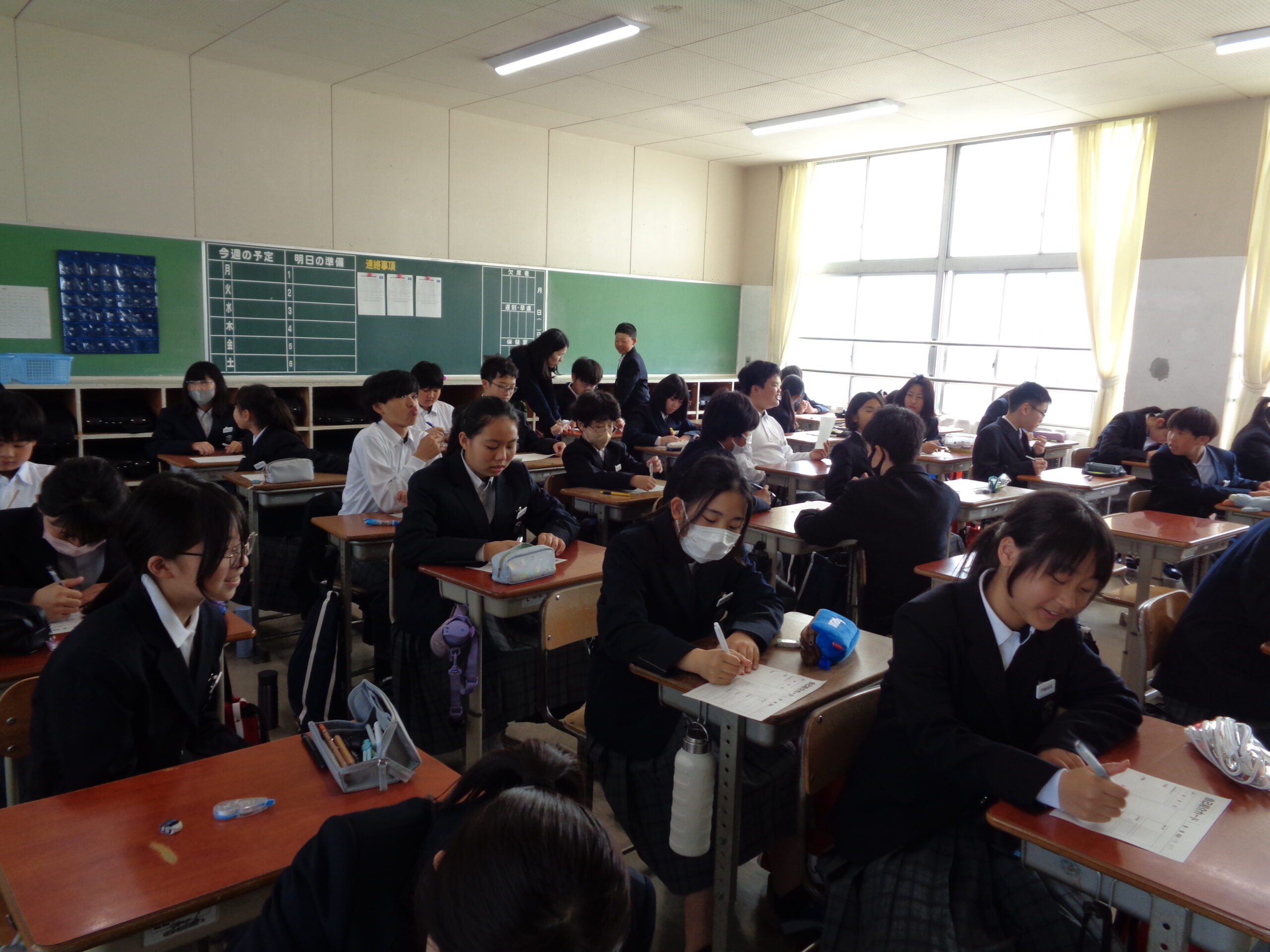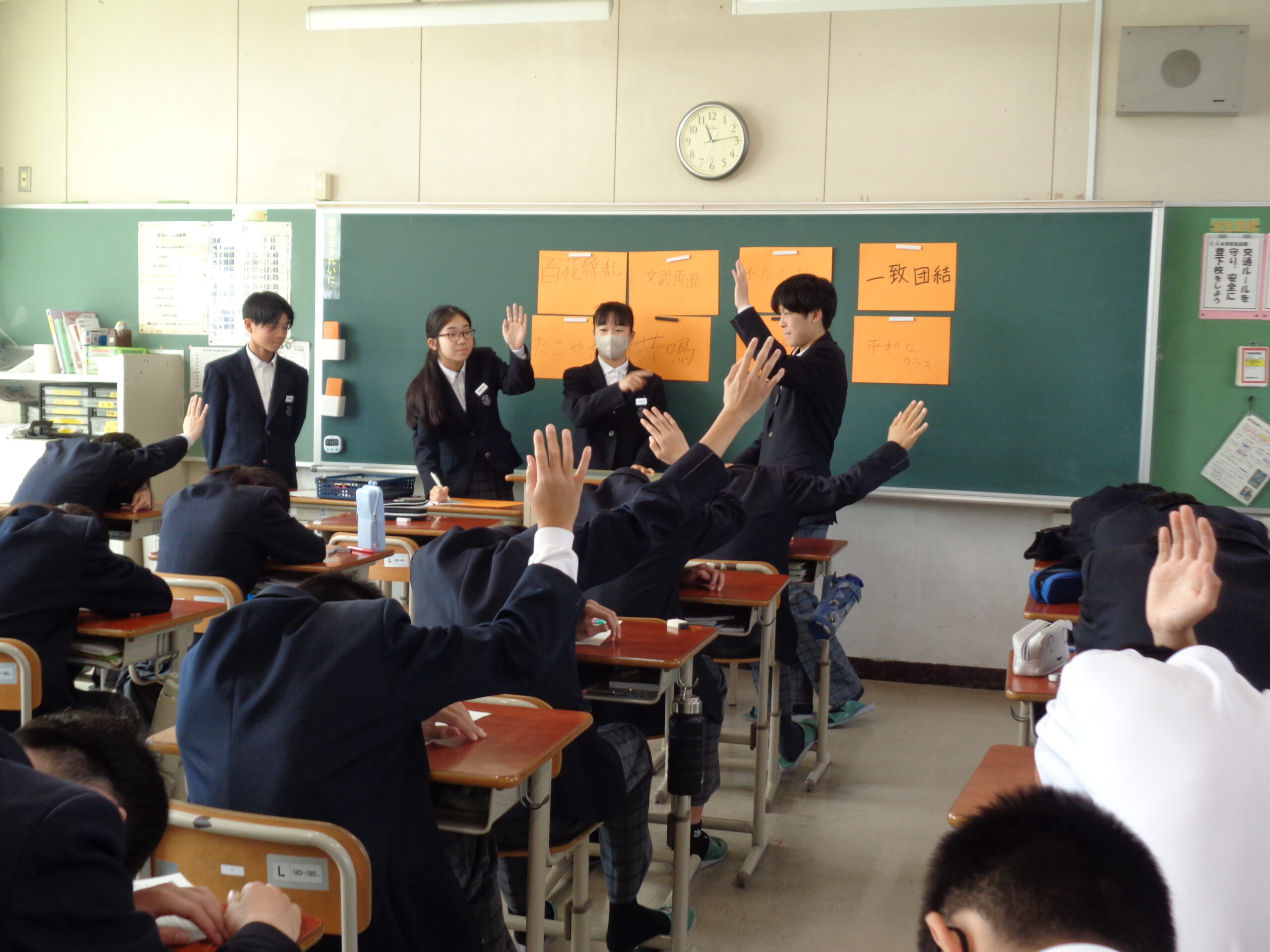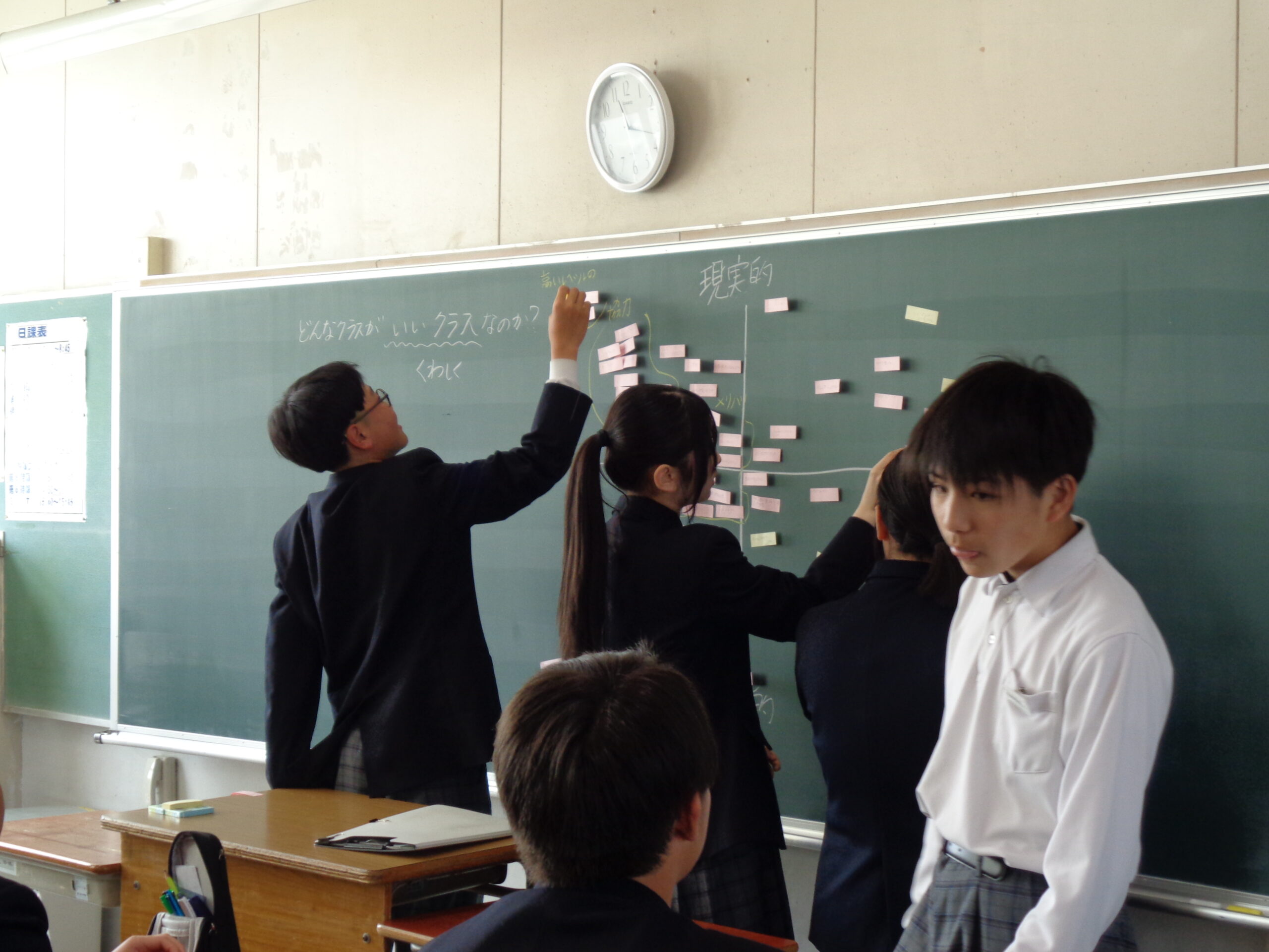 学校ブログ クラスの「合言葉」が決まっています! 2026.04.17 by kaniekita002 2026年4月14日(火) 他学年の教室でも、学級目標決めが行われました。 教師から与えられるのではなく、自分たちで目指すクラスの姿を定め、そこに向かっていくための言葉を探す。黒板が意見でいっぱいになる様子は、「生徒が主役」の学級づくりの光景です。 意見がわれたときには、納得のいく着地点を探っていました。今日決めた目標が、1年後の修了式の日に「達成できたね」と笑顔で振り返れるものになるよう、日々の生活を大切にしていきましょう‼