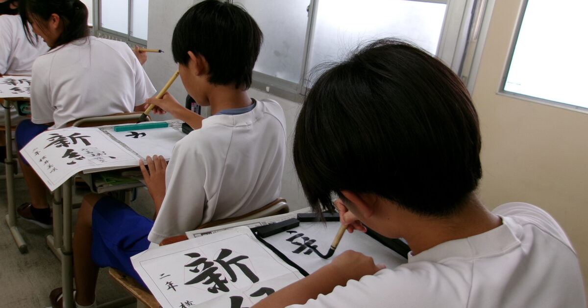 2025年9月10日(水) 国語の時間に毛筆にて「新緑」と書きました。手本をじっくりと見て、穂先の動かし方に気をつけながら書きました。